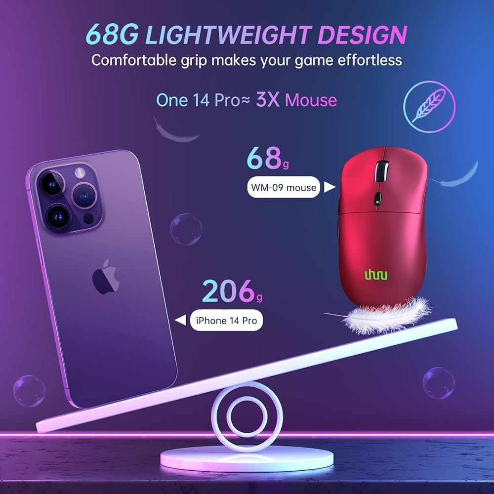 2.39OZ/68G LIGHTWEIGHT DESIBN: With hyperlight redesign achieving nearly 32% weight reduction compared to ordinary gaming mouse. This wireless mouse for gaming is only 68 grams which perfectly combines strength and grams. Making you to enjoy a level of speed and control favored by the world's top players!