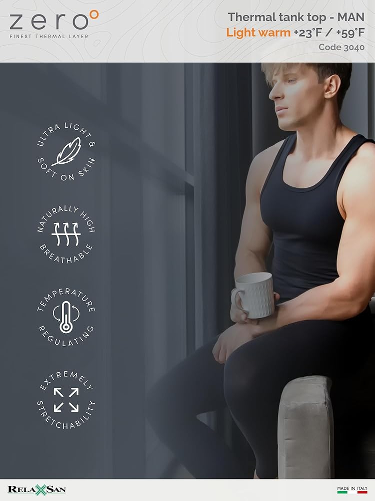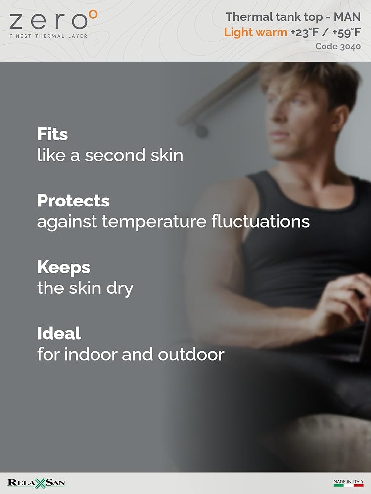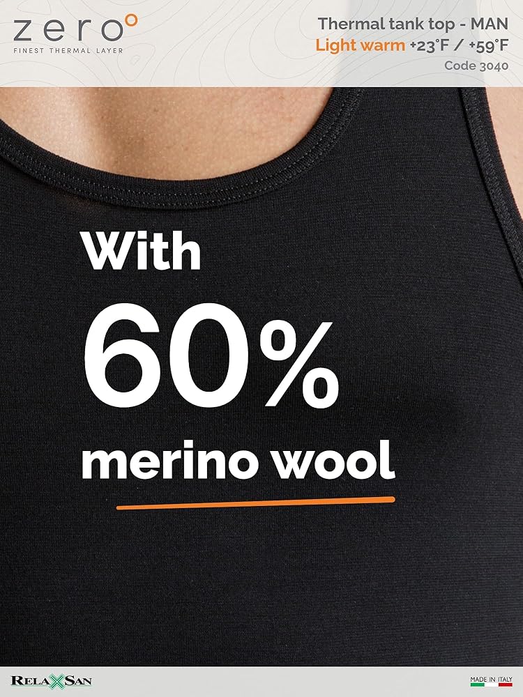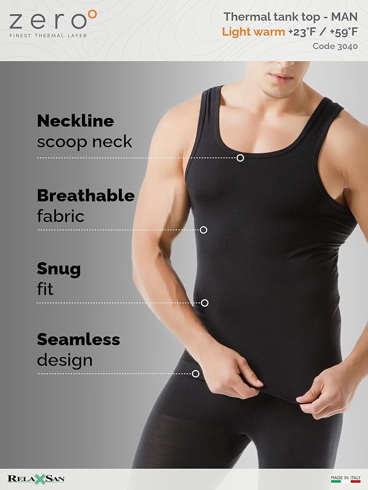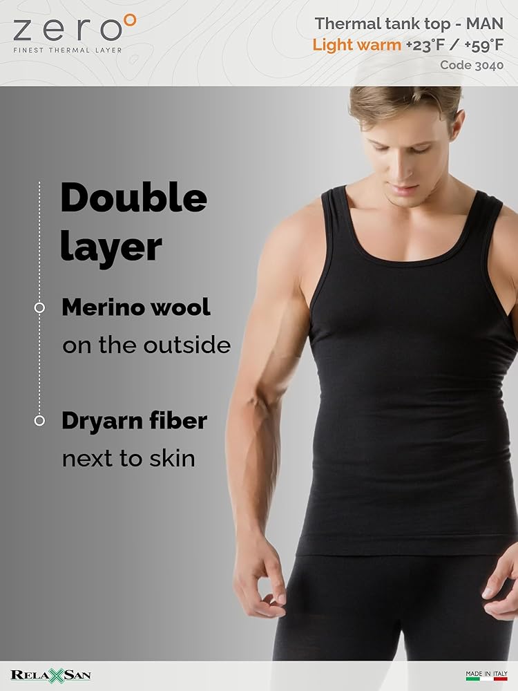 1-PIECE PACKAGE - LIGHT WARM 150 gr/m2 – Men's wide shoulder thermal tank top in merino wool and ultralight Dryarn on the skin. This 150 gr/m2 fabric is ideal as a first layer under everyday clothing or sports activities during seasons without extreme temperatures. It prevents changes in temperature caused by sudden changes in the climate typical of the middle seasons