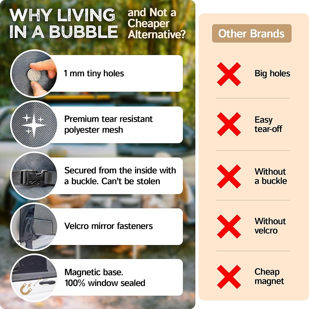 [WINDOW SEALS COMPLETELY] - This unique car window screen is designed with a magnetic base, velcro mirror fasteners, tightening toggles and buckles. Our mesh screen will create a complete seal around your window. These are secured to your car and can not be stolen while you sleep.