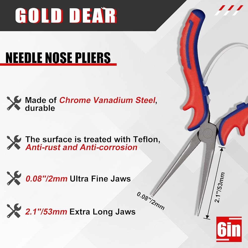 GOLD DEER 6" Mini Needle Nose Pliers Extra Long Needle Nose Pliers for Jewelry Making, CRV Steel Body with Teflon Finish and Professional Handle, Precision Wire Plier for Bending Small Object Gripping