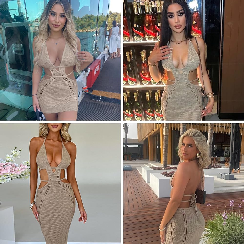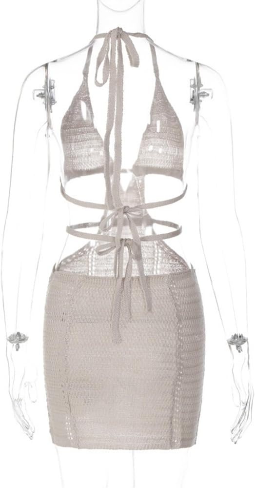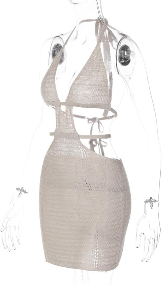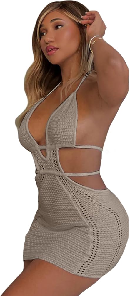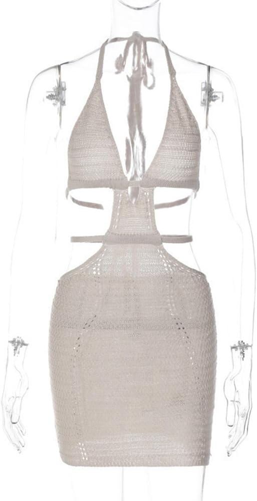 ZGMYC Women's Sexy Halter Hollow Out Knitted Mini Dress Sleeveless Backless Lace Up Bodycon Summer Beach Dress Club Party Dresses