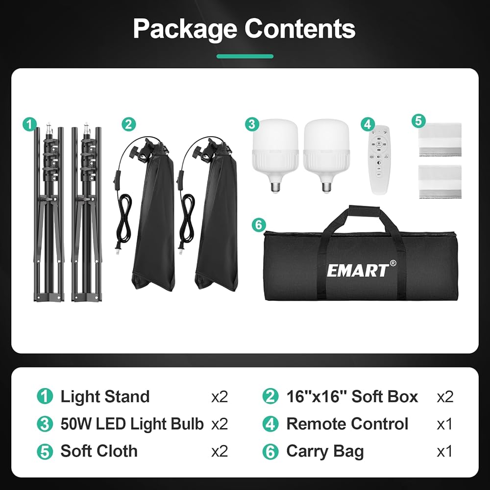 【Rich Package Contents】 2 * 16"x 16"Soft box(Head 210° adjustable); 2 * 3000K-6000K 50W LED Bulb (with Remote Control); 1 * Carry Bag;2 * (17"to 63"/43cm-160cm Height Adjustable ) Light Stand; We will Provide 12 Months of Free Warranty, and Lifetime Professional Customer Service. Any questions, Feel Free to Contact our Customer Service Staff.