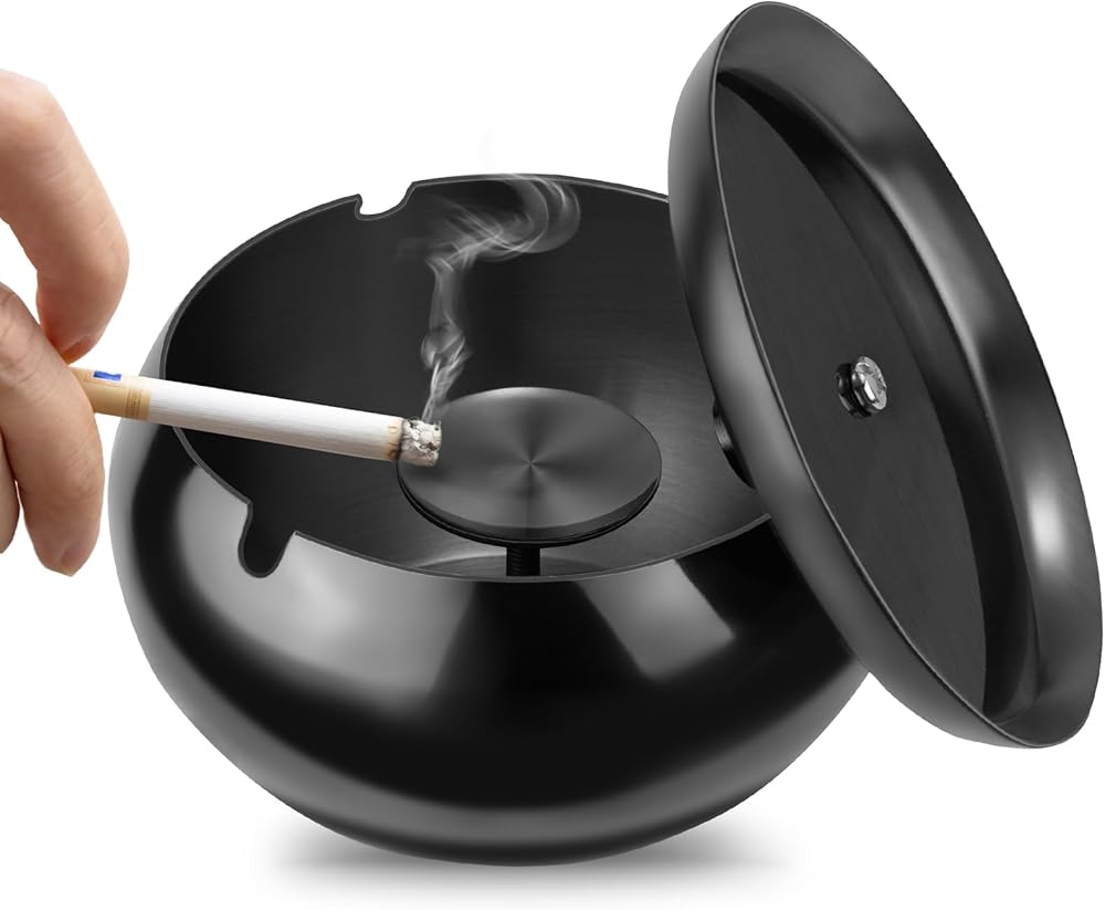 Outdoor Ashtray- Perfect for outdoor and indoor use. Features a lid to keep the rain out, and has enough weight to withstand stormy weather with high winds.