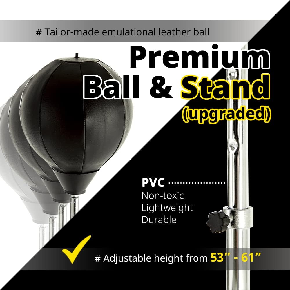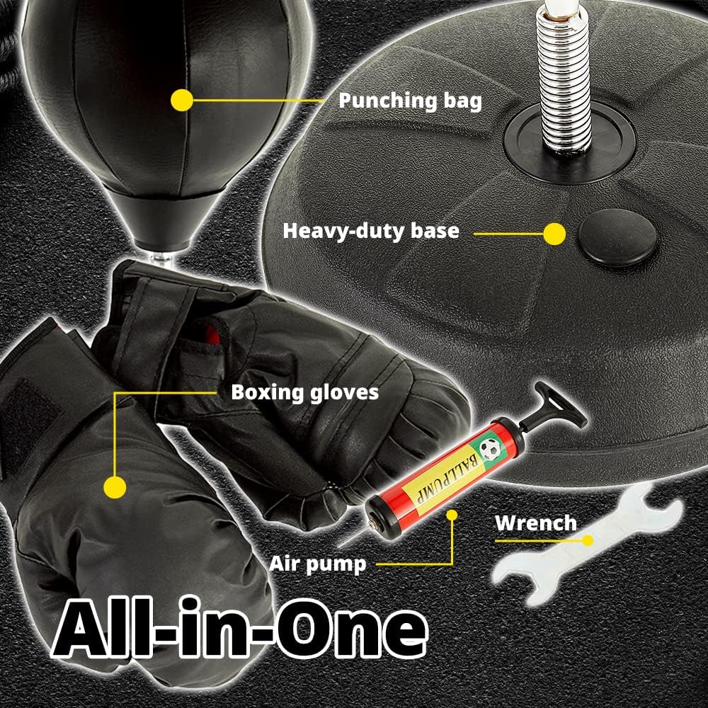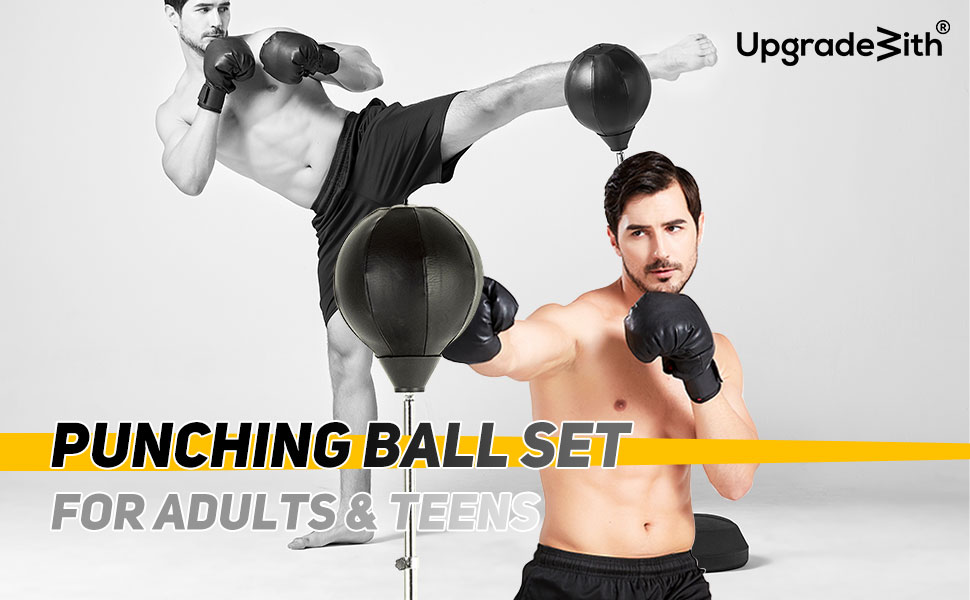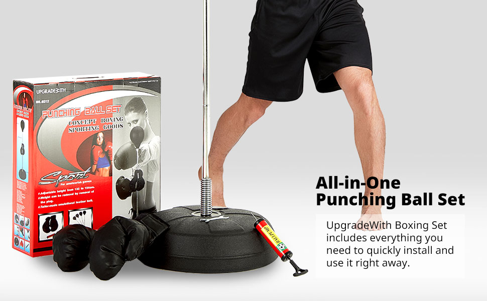 COMPONENTS : UpgradeWith's adult punching bag provides an air pump, durable boxing gloves in the whole package so you can enjoy this product without having to purchase your own gloves! The height of the standing punching bag for adults can be adjusted from 53 inches to 61 inches. Also, the leather ball is tailor-made to be suitable for this exercise.