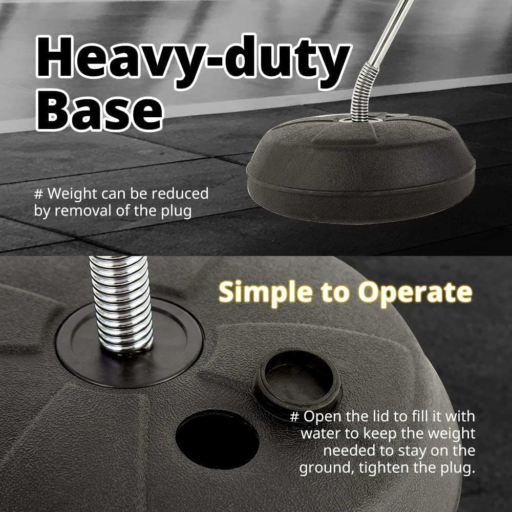 SIMPLE TO OPERATE: To keep this boxing bag stand strong - open the lid of the water injection port at the bottom, fill it with water to keep the weight needed to stay on the ground, tighten the plug. This makes the punching bag more stable and strong. It is crucial that the boxing bag stand stays heavy so that it stays vertical even after a lot of strength has been put into it.