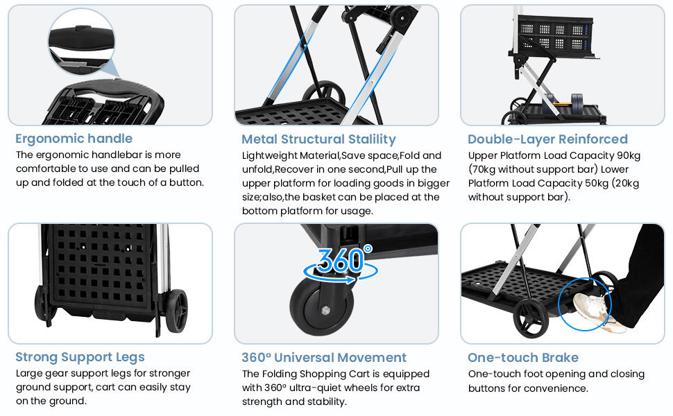 Easy and Fast Folding: Shopping Cart structure is ergonomically designed with one-touch mounted folding buttons for the feet and hands, just one-touch operation of the hand and foot buttons can easily realize quick folding and opening, saving time and effort.