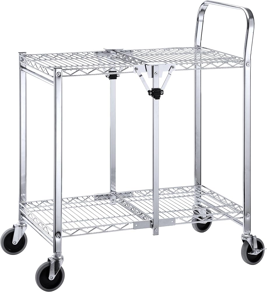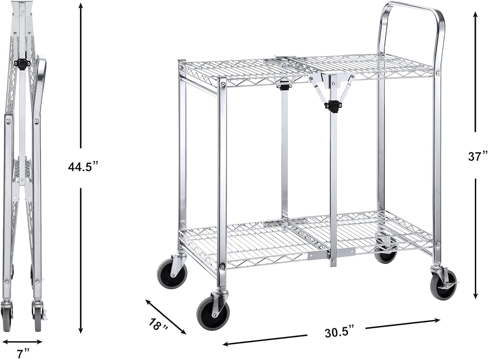 2 Tier Commercial Grade Heavy Duty Utility Cart | Holds up to 300lbs | Easy Foldable | Durable Chrome Plated Steel Heavy Duty Rolling Cart for Garage, Warehouse, Showroom and Office