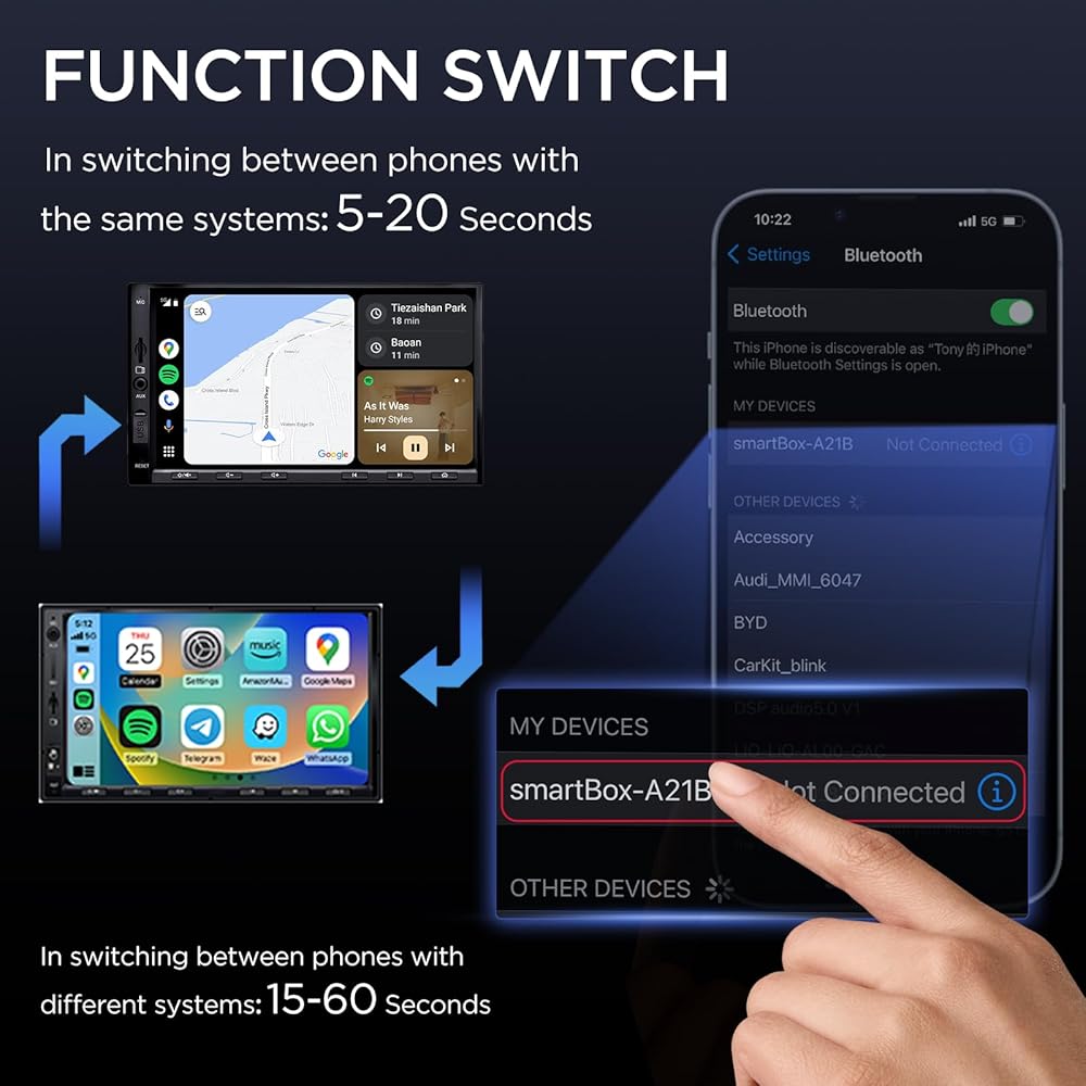 🚗 【ONE-CLICK SWITCH: CarPlay or Android Auto】Just turn on the Bluetooth and Wi-Fi of the phone you want to connect, pair with Bluetooth, and you're all set ( Note: When switching from Android Auto to CarPlay, you'll need to turn off Bluetooth and Wi-Fi on your Android phone). Switching between the same phone systems takes just 5-20 seconds while switching between different phone systems and changing the system requires 15-60 seconds.