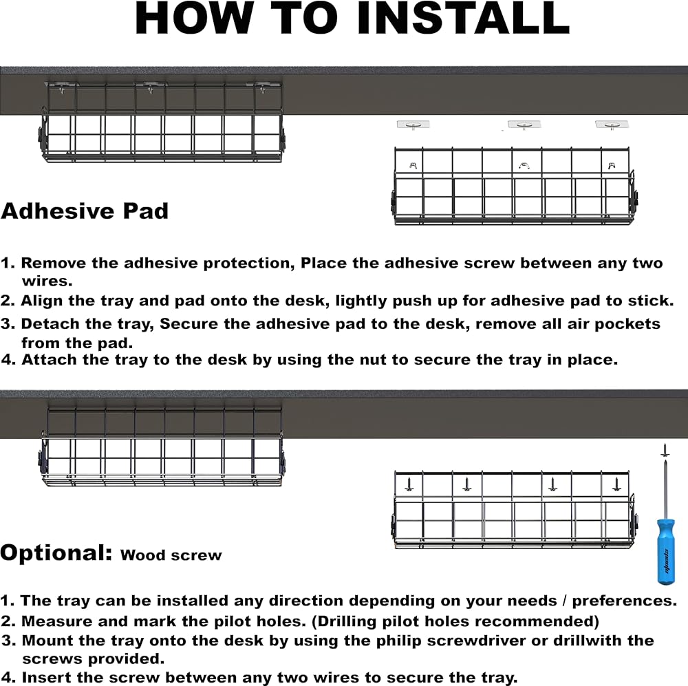 The item can be installed under the wood, MDF, or particleboard desk. This product includes 10 screws / 6 adhesives and requires a screwdriver / drill for assembly
