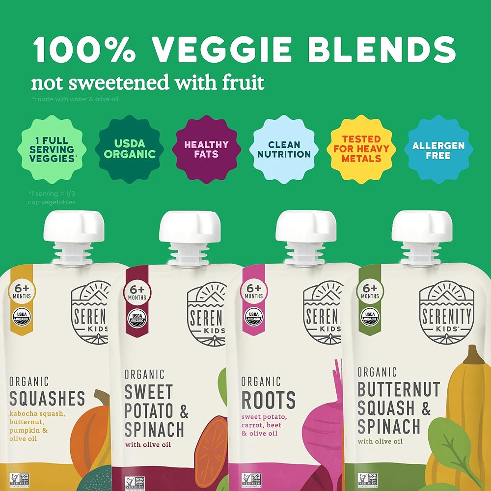 ORGANIC SQUASHES: Contains 6 pouches of baby food purees made from organic kabocha squash, butternut and pumpkin plus healthy fats from olive oil.