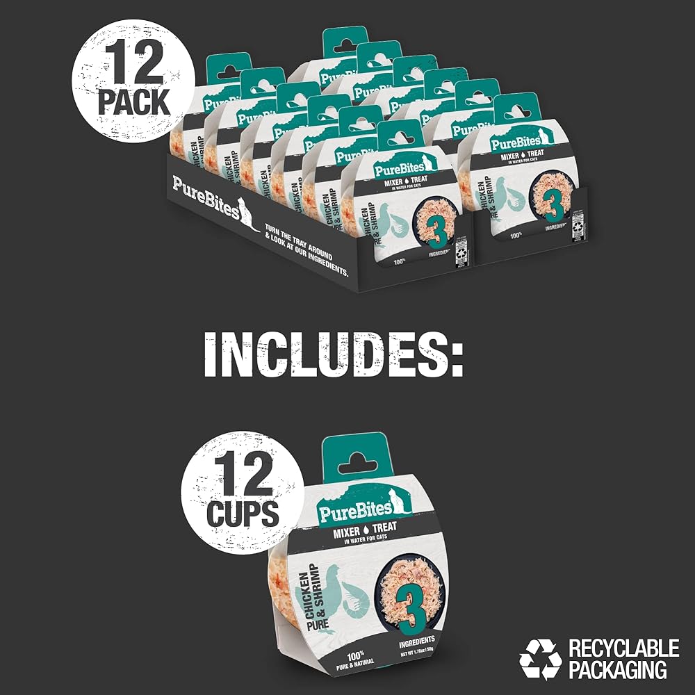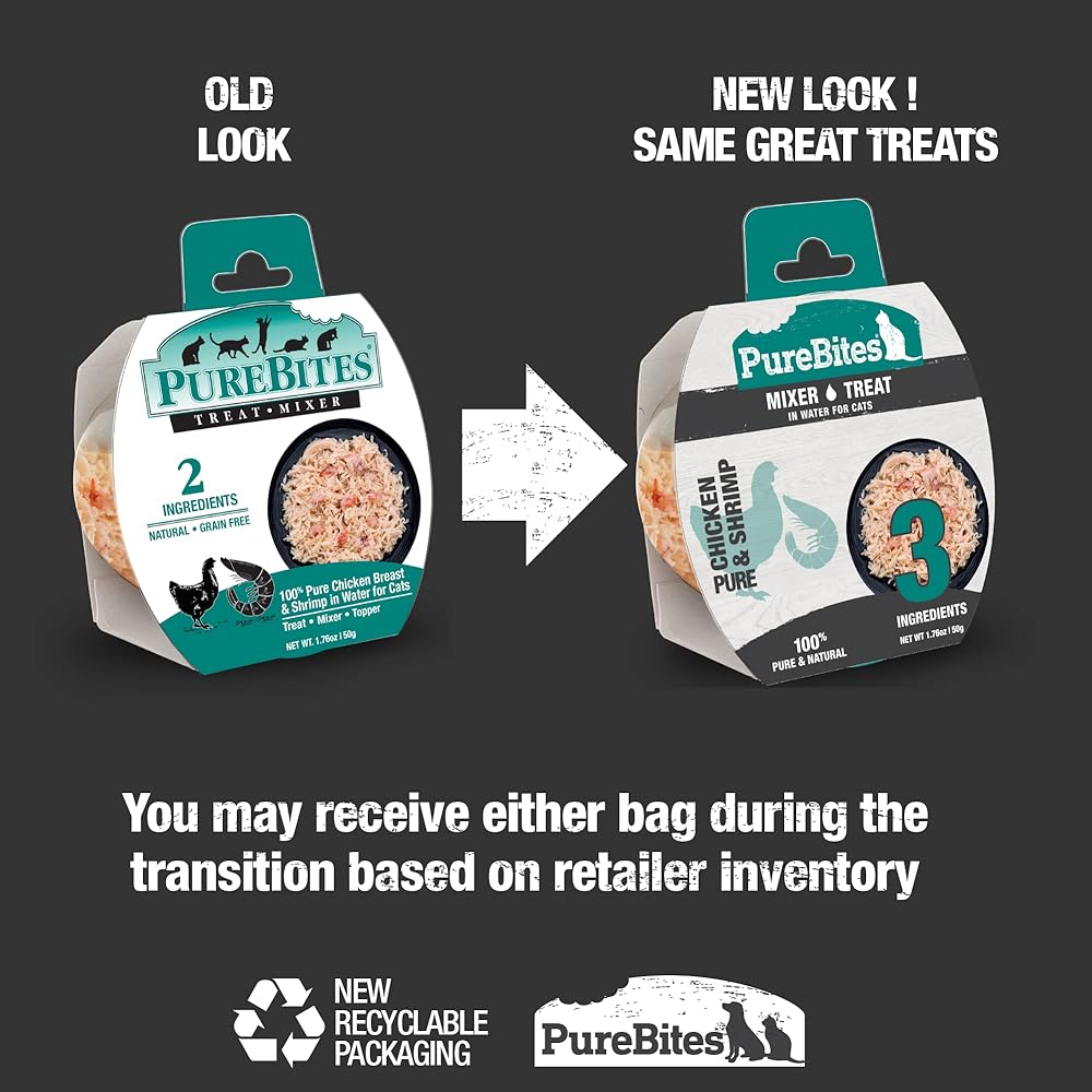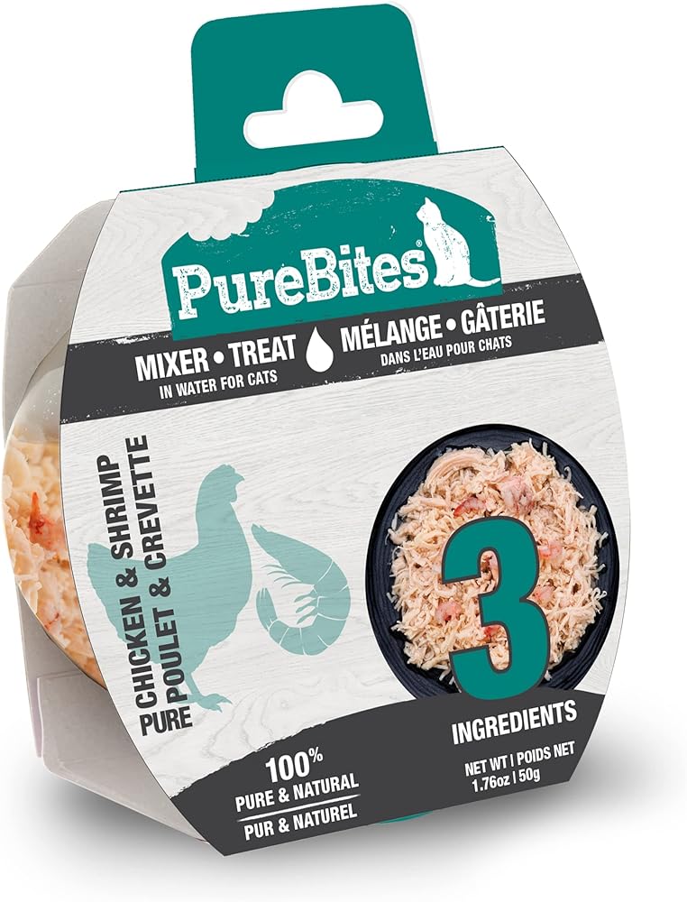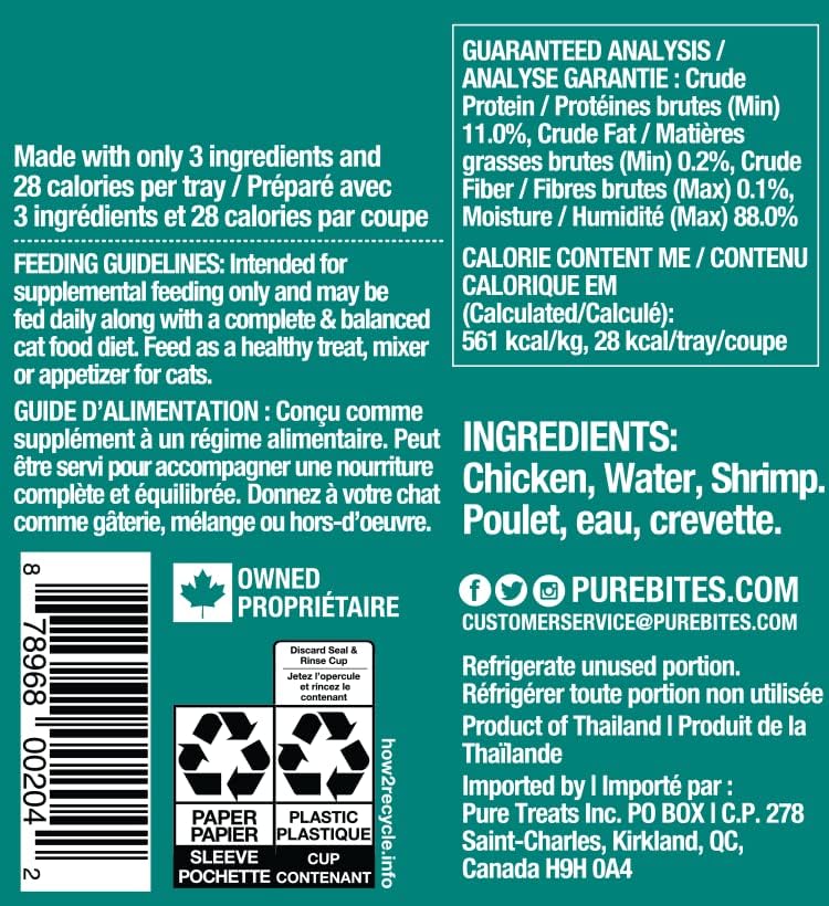 Go ahead, turn the tray around and look at our ingredients. PureBites Mixers for cats are made with only 2 ingredients; 100% Pure Chicken Breast & Wild Ocean Shrimp in water. Cats love the taste of PureBites because our treats are pure, locking in the aroma, texture and freshness they crave. Cat parents love PureBites because our treats are rich in nutrients for a happy and healthy life.