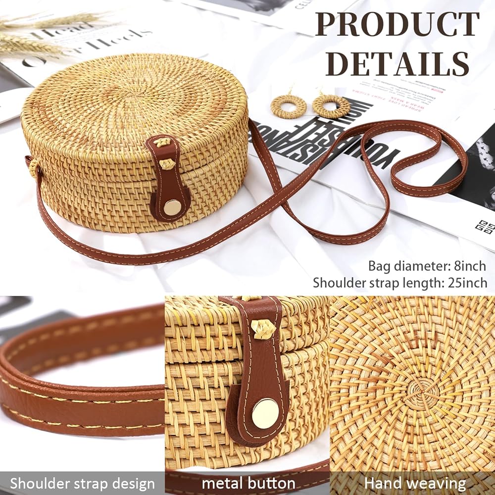 [Product Details] With a diameter of 8 in(20cm), the beach purse can hold everyday items such as smartphone, wallet, lipstick and keys. The metal button can be switched on and off well. The soft shoulder strap makes it more comfortable to wear, and the narrow shoulder strap design makes this rattan purse more delicate.