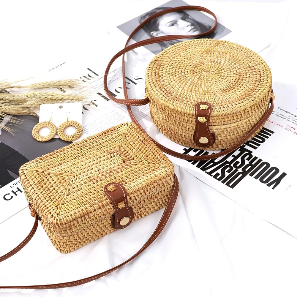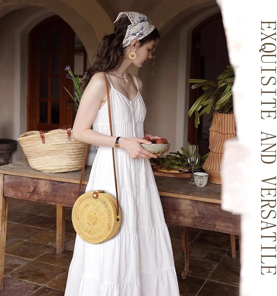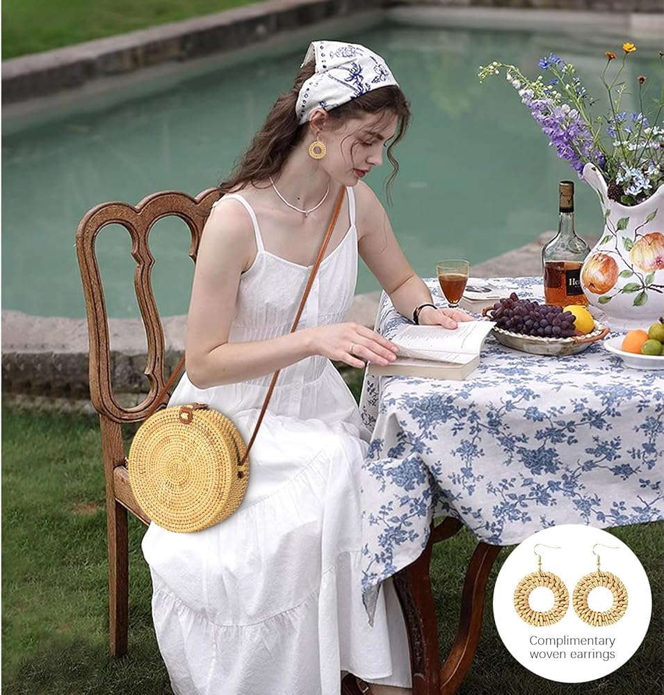 [Fashion Unique Women's Bag] Straw bag is very exotic ethnic style, unique materials, beautiful shape, women and girls are very suitable for application. Summer beach, gentle evening breeze, sunset, bring this round purse for women and complimentary Rattan Earrings to brighten up your date.