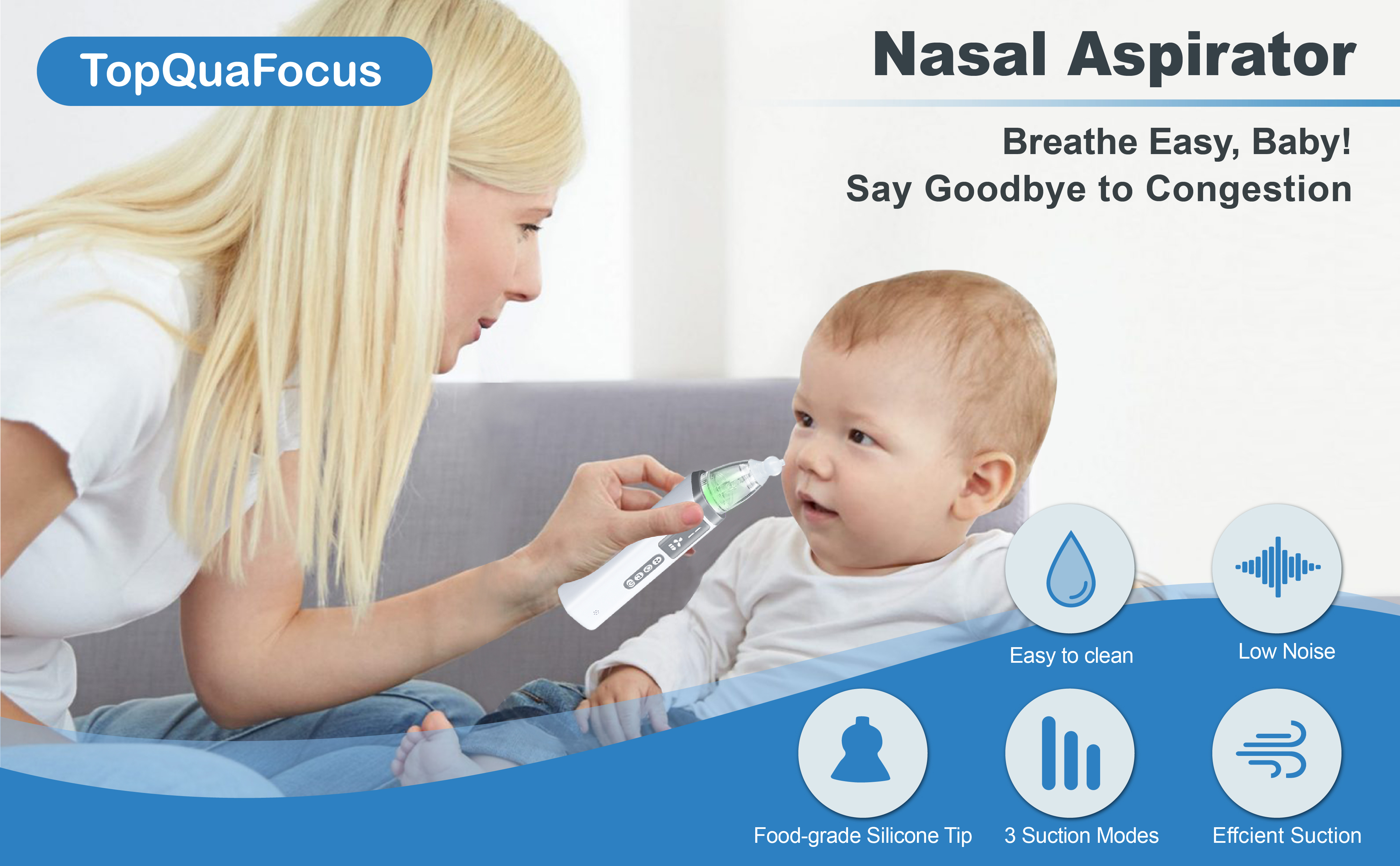 Adjustable Suction Levels: The TopQuaFocus Nasal Aspirator has 3 levels of suction power to choose from for easy and effective instant removal of liquid or dry mucus. Suitable for infants, toddlers and adults aged 0-12 years, you can easily adjust the suction power to suit your needs.