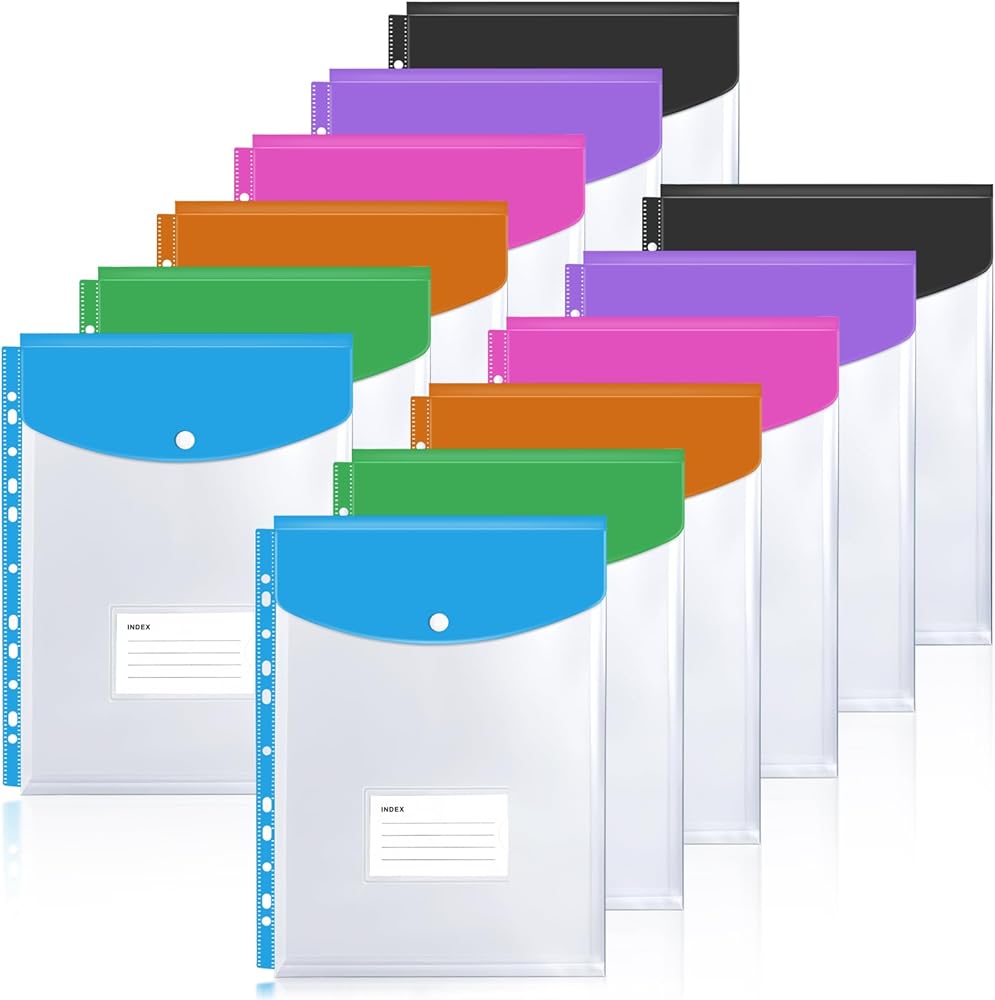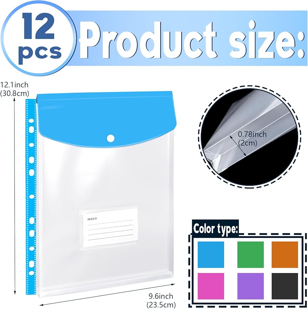 DLOnline 12 Pack Binder Pocket Expandable Folders 11 Holes Plastic Envelopes for 2/3/4 Ring Binder A4/Letter Document Pouch for School Home Office (Vertical-Opening)