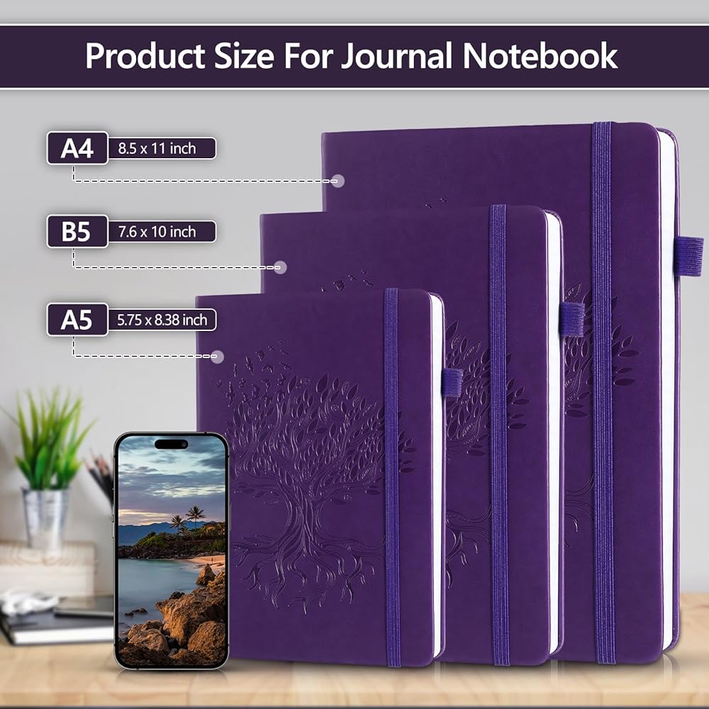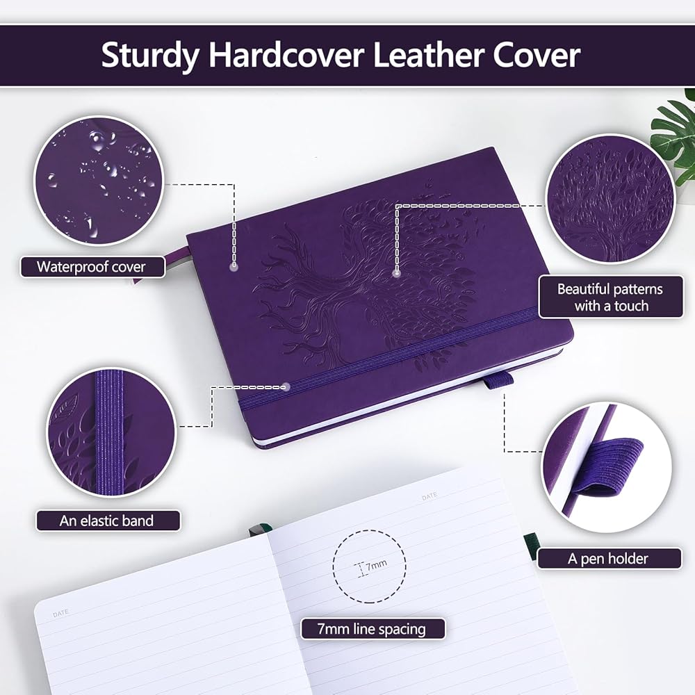 Thoughtful Design: This note book includes a folder in the back, an elastic strap to keep the book closed, two book markers and a nice elastic pen holder. 5.75 x 8.38 inch large notebook features water-resistant vegan leather cover.