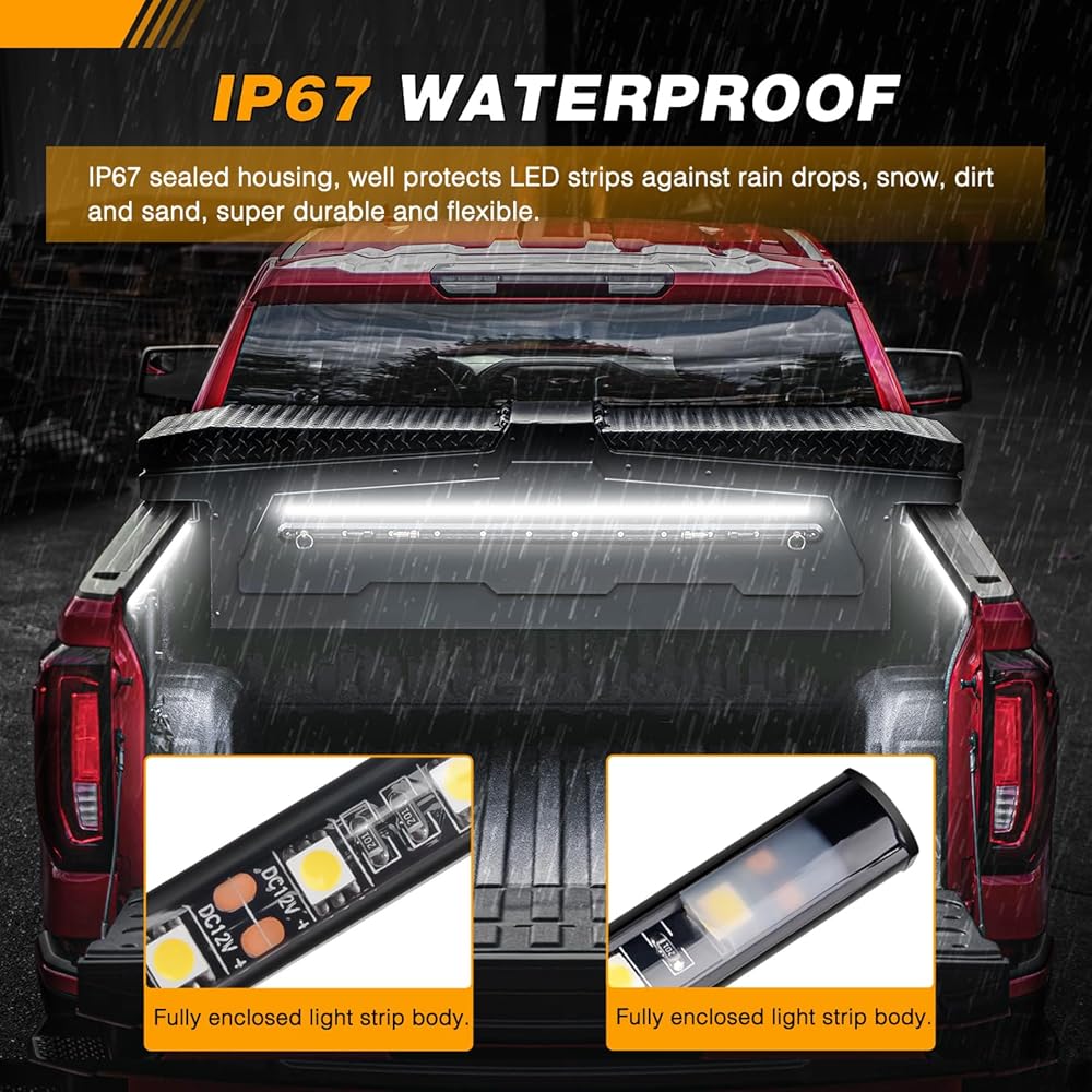 Easy Installation: The RGB truck bed light strip comes with self-adhesive tape and extra cable ties, screws, and fasteners. Simply clean the mounting location, peel and stick the light bar on any surface you desire. It's hassle-free and convenient