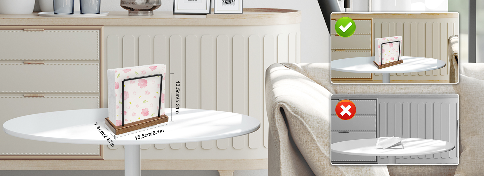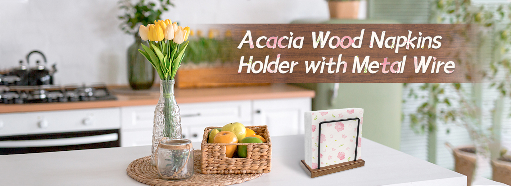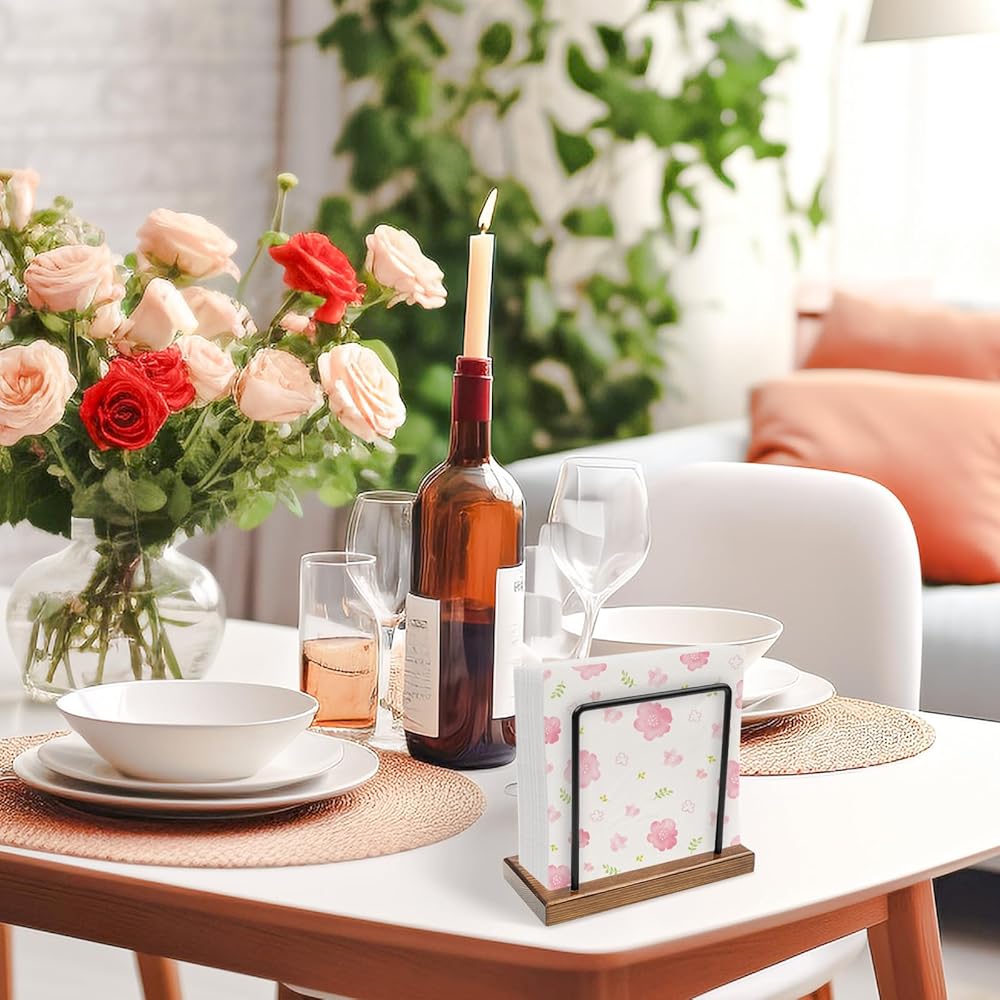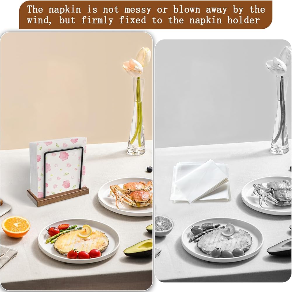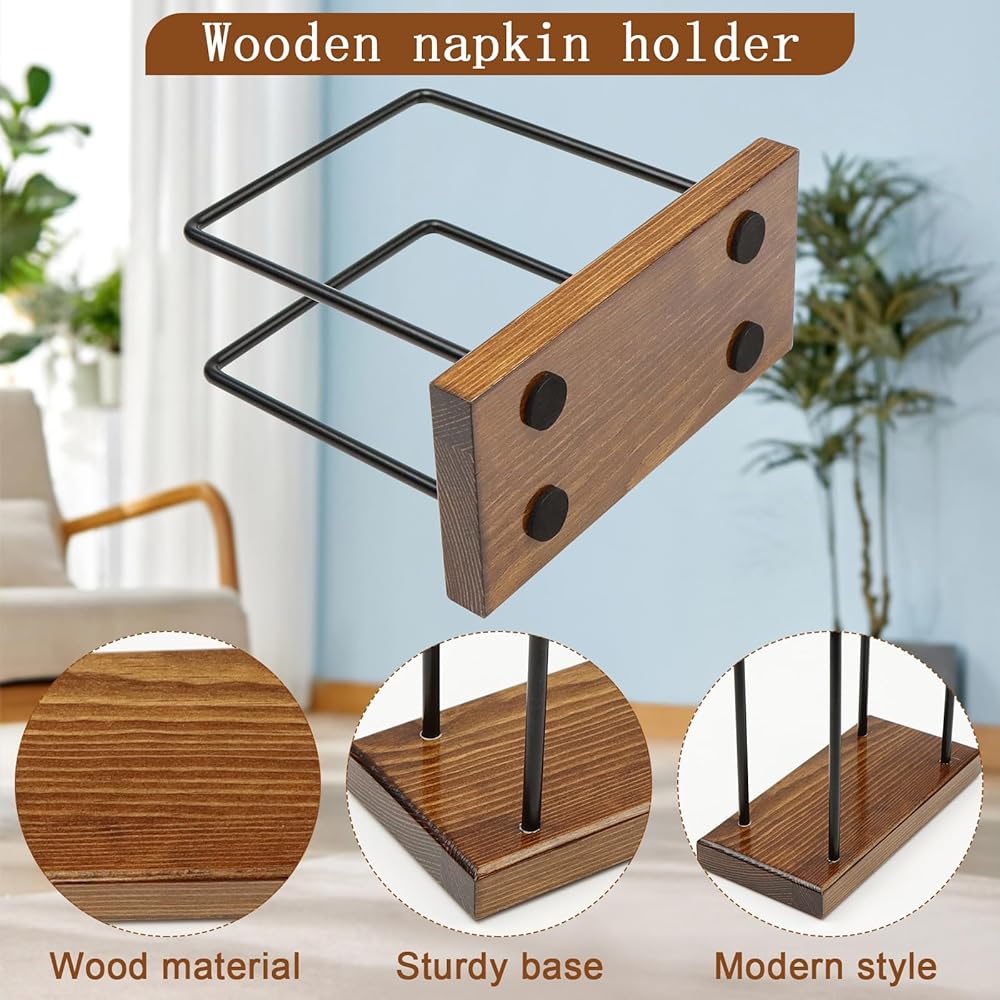 【Premium Material】: Crafted from high-quality wood and made from sturdy metal rods, our napkin holder for table ensures stability and securely holds your napkins in place. Say goodbye to messy, falling apart napkins.