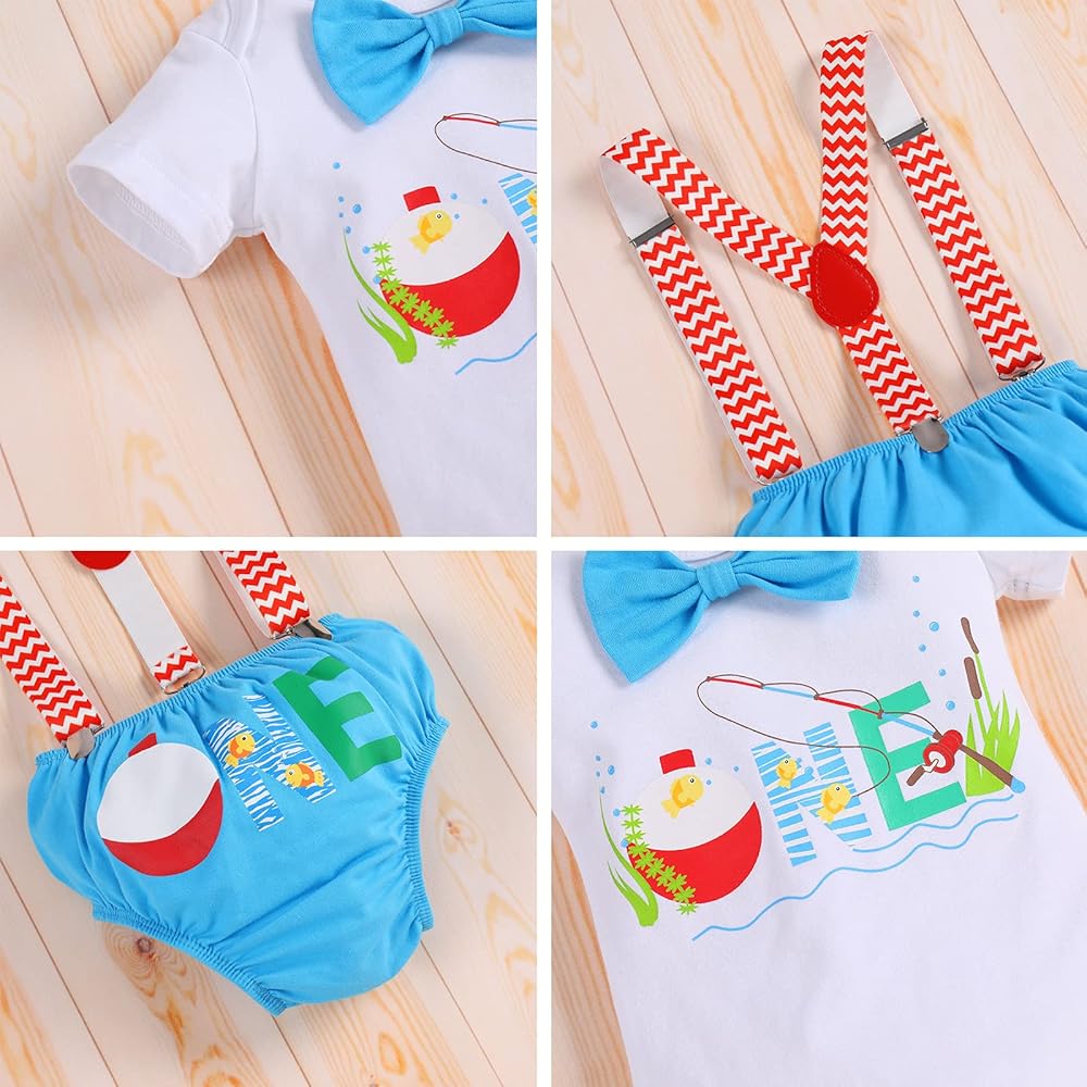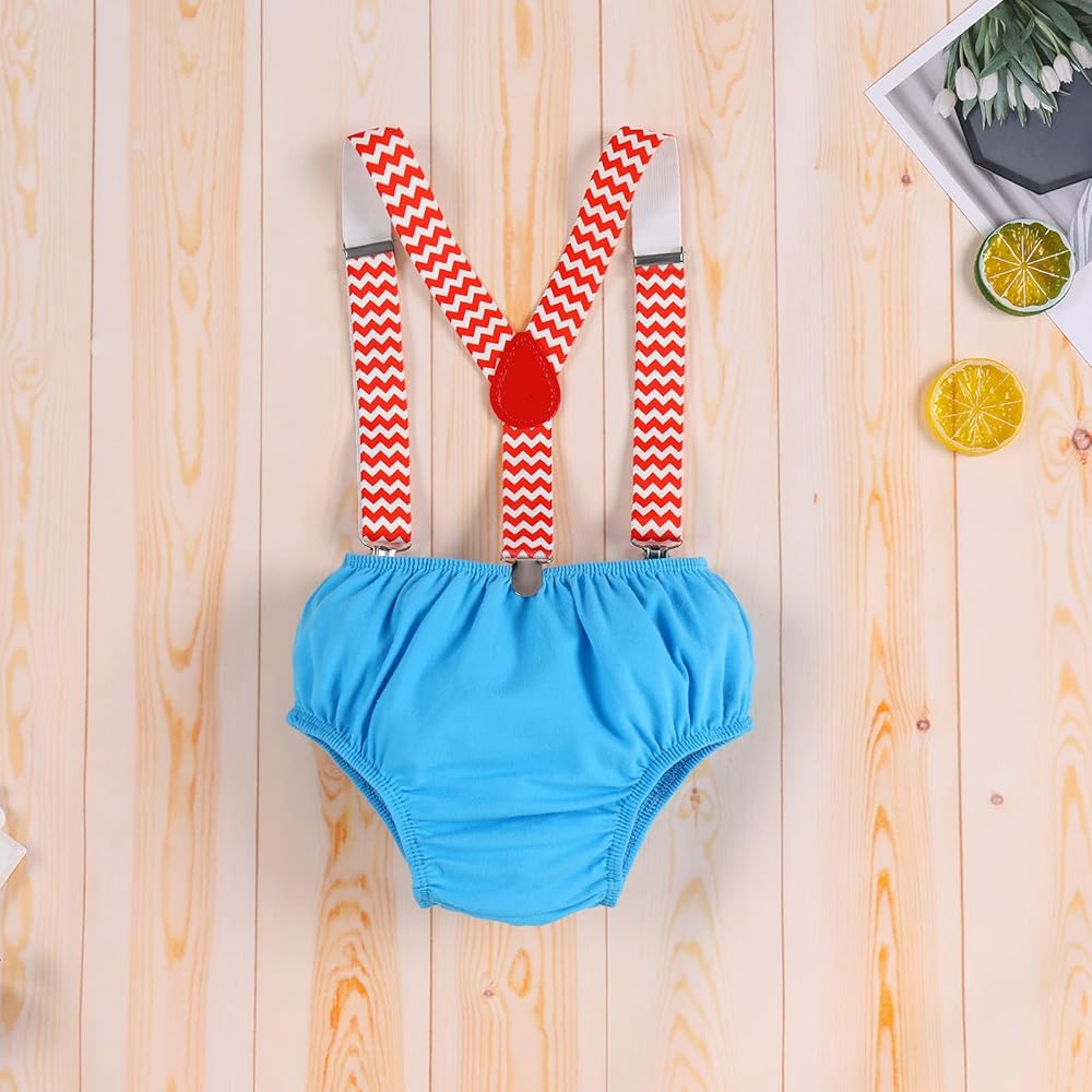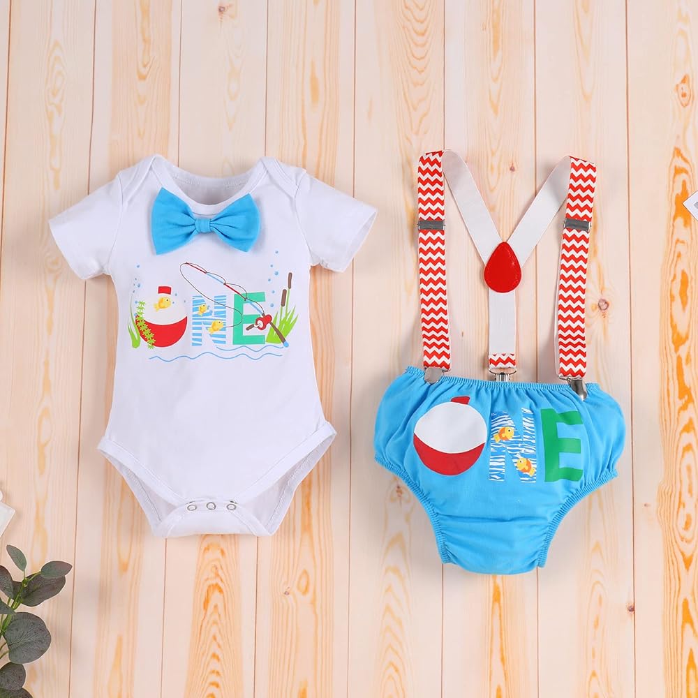 Features: Short Sleeve, Round Neck, Lapped Shoulder, Bowtie, Snaps, Whale, Number 1 Print, Adjustable Suspenders