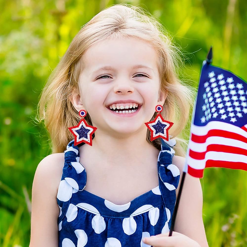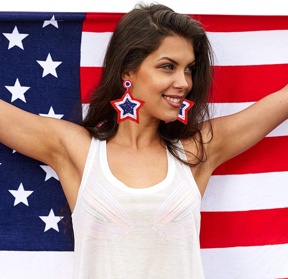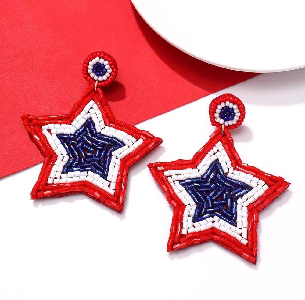 In season trending must have pair of earrings that has a patriotic stars dangle earrings design. Great for any Summer occasion and casual event! Every girl needs patriotic jewelry accessories on July 4th! These dainty seed beaded earrings to celebrate the U.S.A. No matter the time of year but are a must have for your 4th of July celebration!