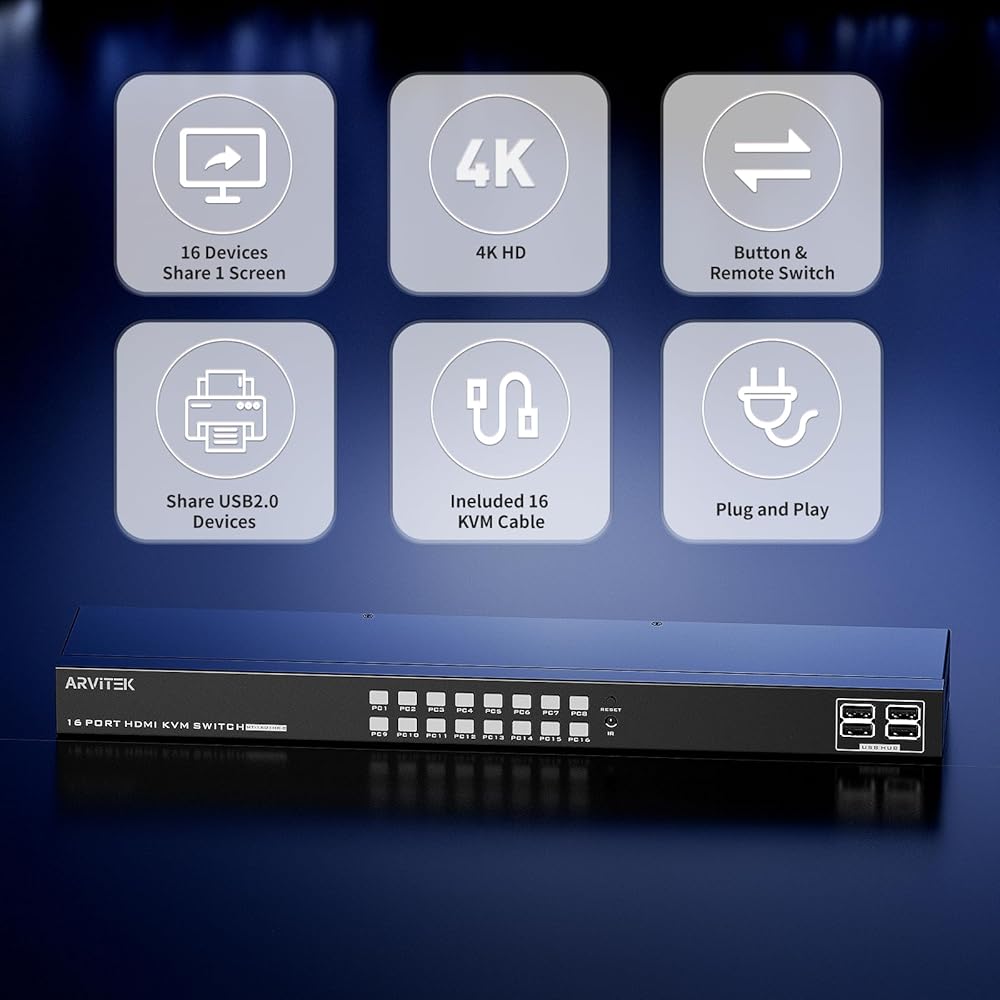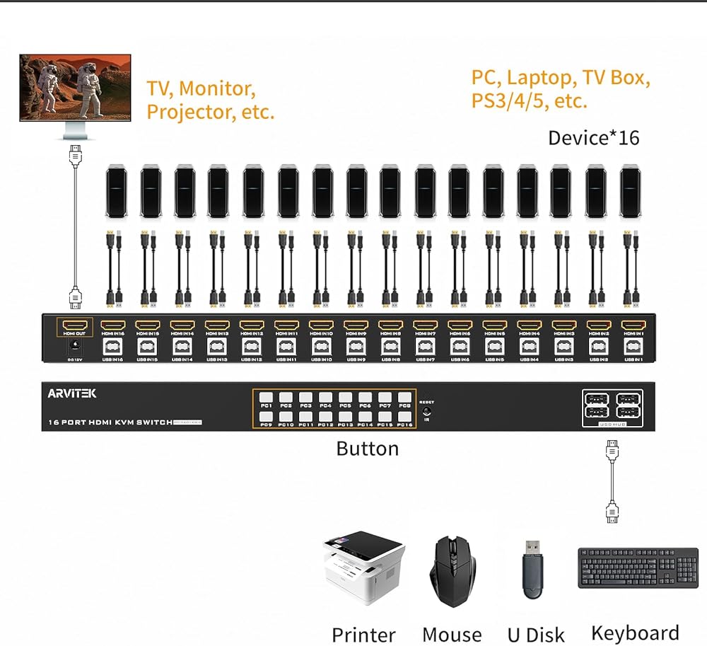 Arvitek 8 Port USB VGA KVM Switch box allows you to control 8 computers with only 1 set of controls (Mouse , Keyboard , Printer and Monitor).It comes with 8 KVM cables.