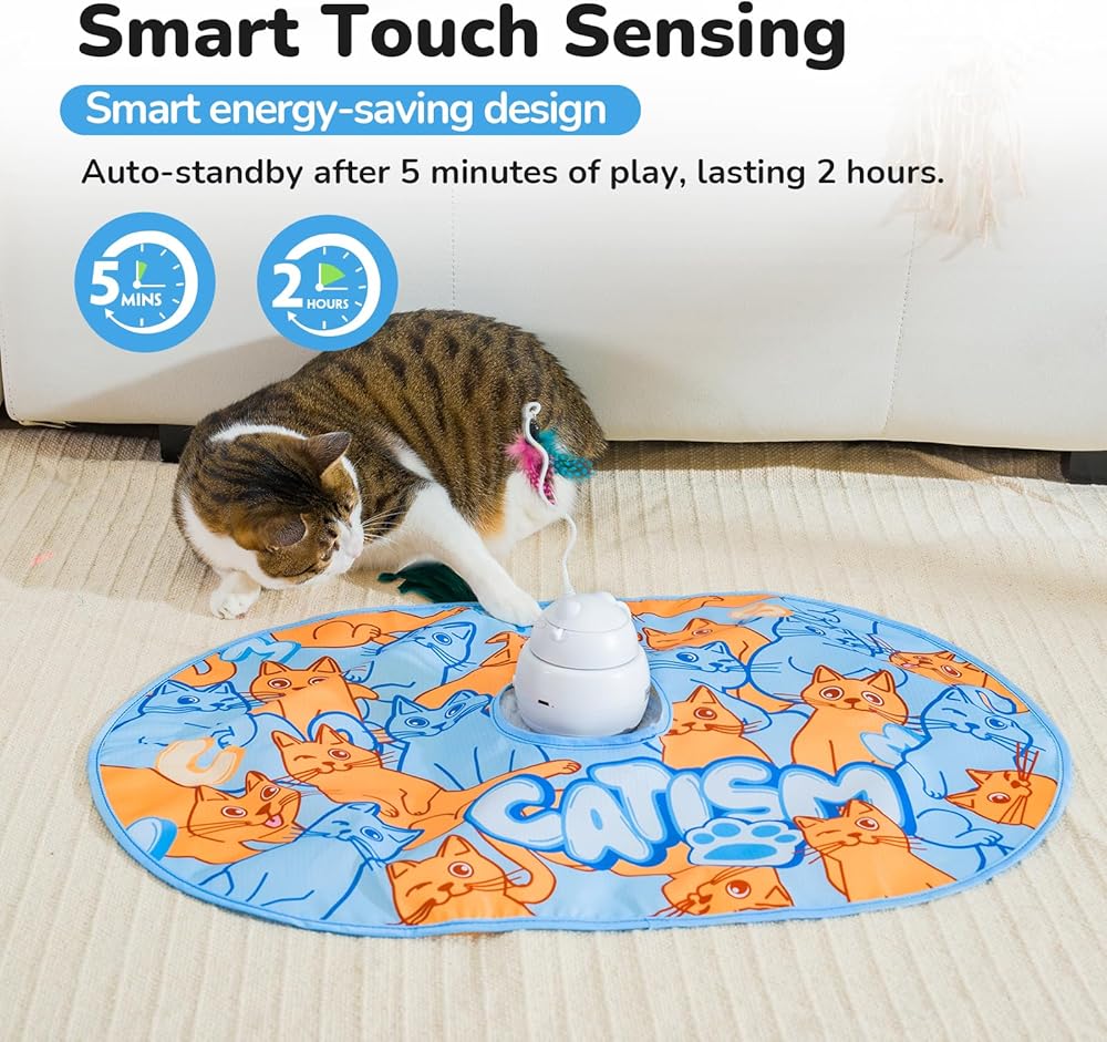 ✅【Interactive Entertainment】CATISM interactive cat toy provide an exciting play experience for kittens. When the feathered Stick rotates under the cover, it starts the attractive game mode of catching and hiding; the feather springs follow the ball to rotate and lure cats to chase and pounce; the red light leads them to chase and greatly stimulates cats' nature of chasing, pouncing and playing.