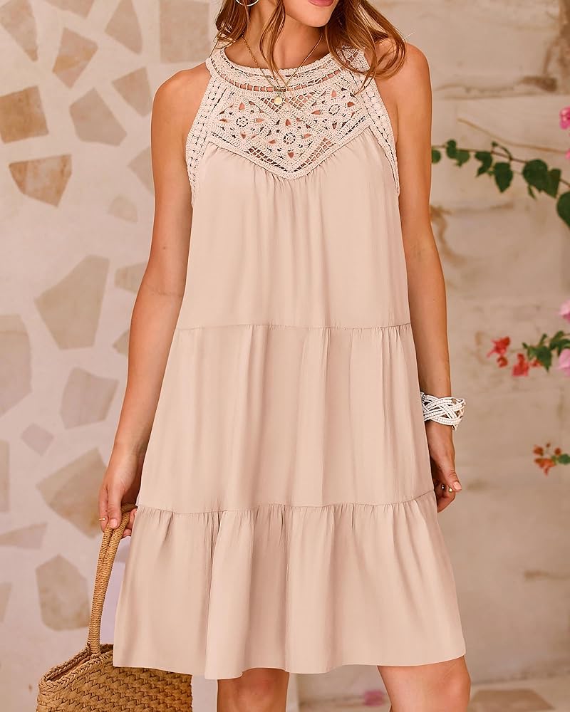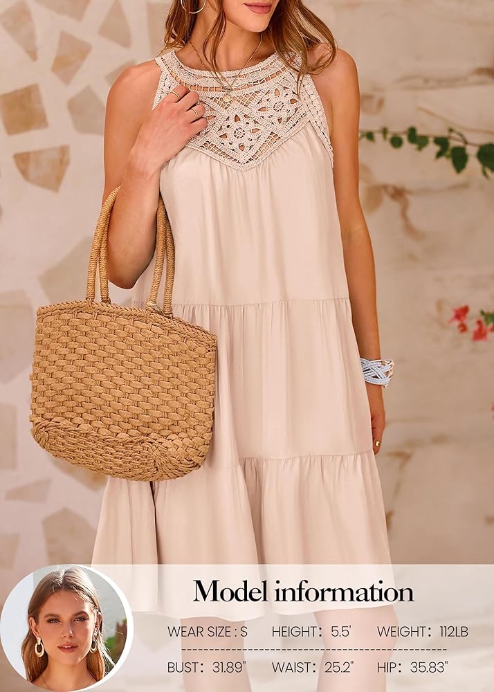 Sundresses for Women Casual Beach: With Its Captivating Hollow-Out Floral Pattern Detailing, This Halter Top Dress Sets Itself Apart From The Crowd. Step Into Summer Bliss With Our Tiered Swing Flowy Beach Vacation Dress! Boasting a Layered Design That Cascades Gracefully Down Your Body, And Flows To The Dress.