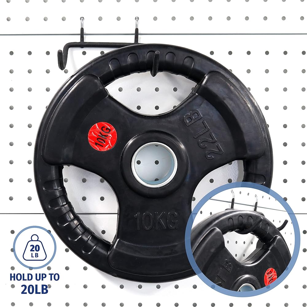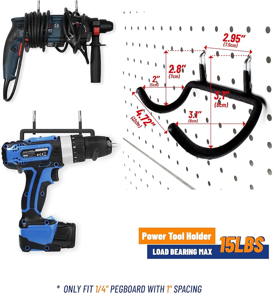 [ITEM SPECIFICATION] Each hook can hold up to 20lbs. Our pegboard hooks have a good clean organized look which is perfect for holding cordless or corded electric drills and other power tools.