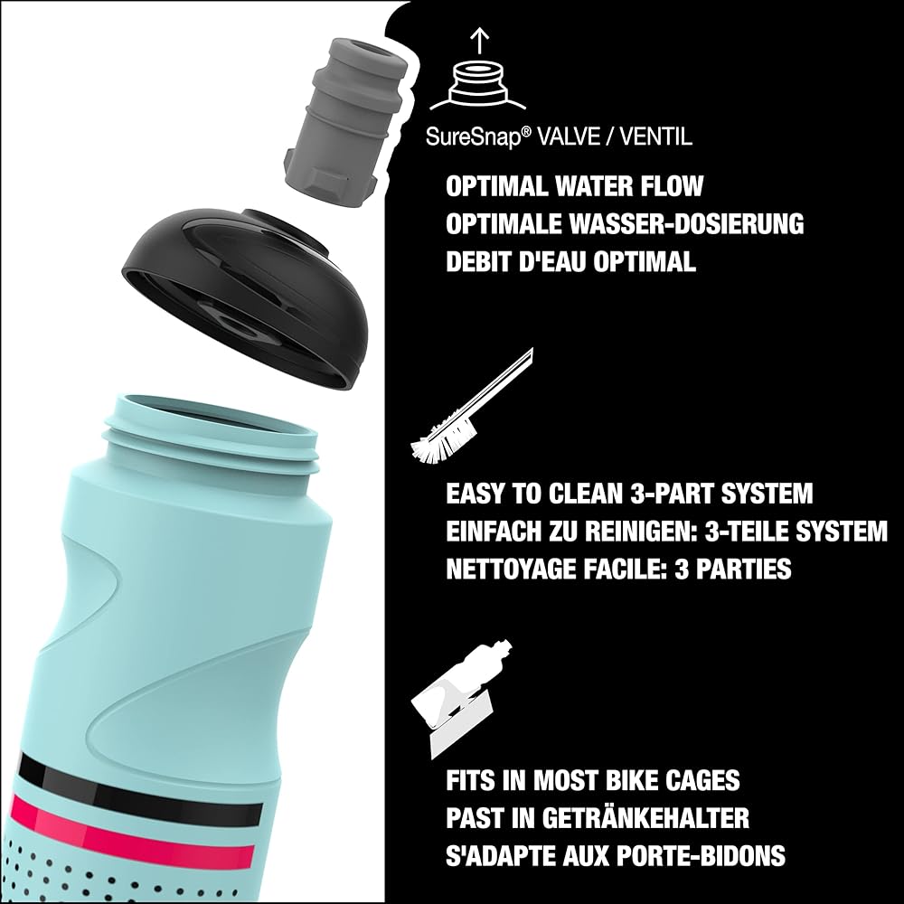 LEAKPROOF WATER BOTTLE & DISHWASHER SAFE: With its SureSnap valve integrated in the mouthpiece, this sport water bottle is fully spillproof even if open and held upside down. Once home, stick it in the dishwasher before going out cycling again.