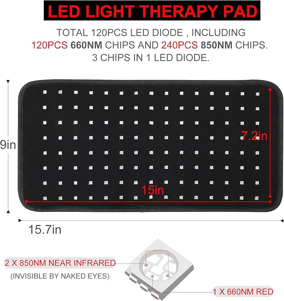 15” x 7.2” large treatment area and better coveage. Powerful 25W led lights, including 120 red light (660 nm ) and 240 invisible infrared lights(850 nm), total 360 powerful medical-grade lights chips, making treatment time dramatically shorter.