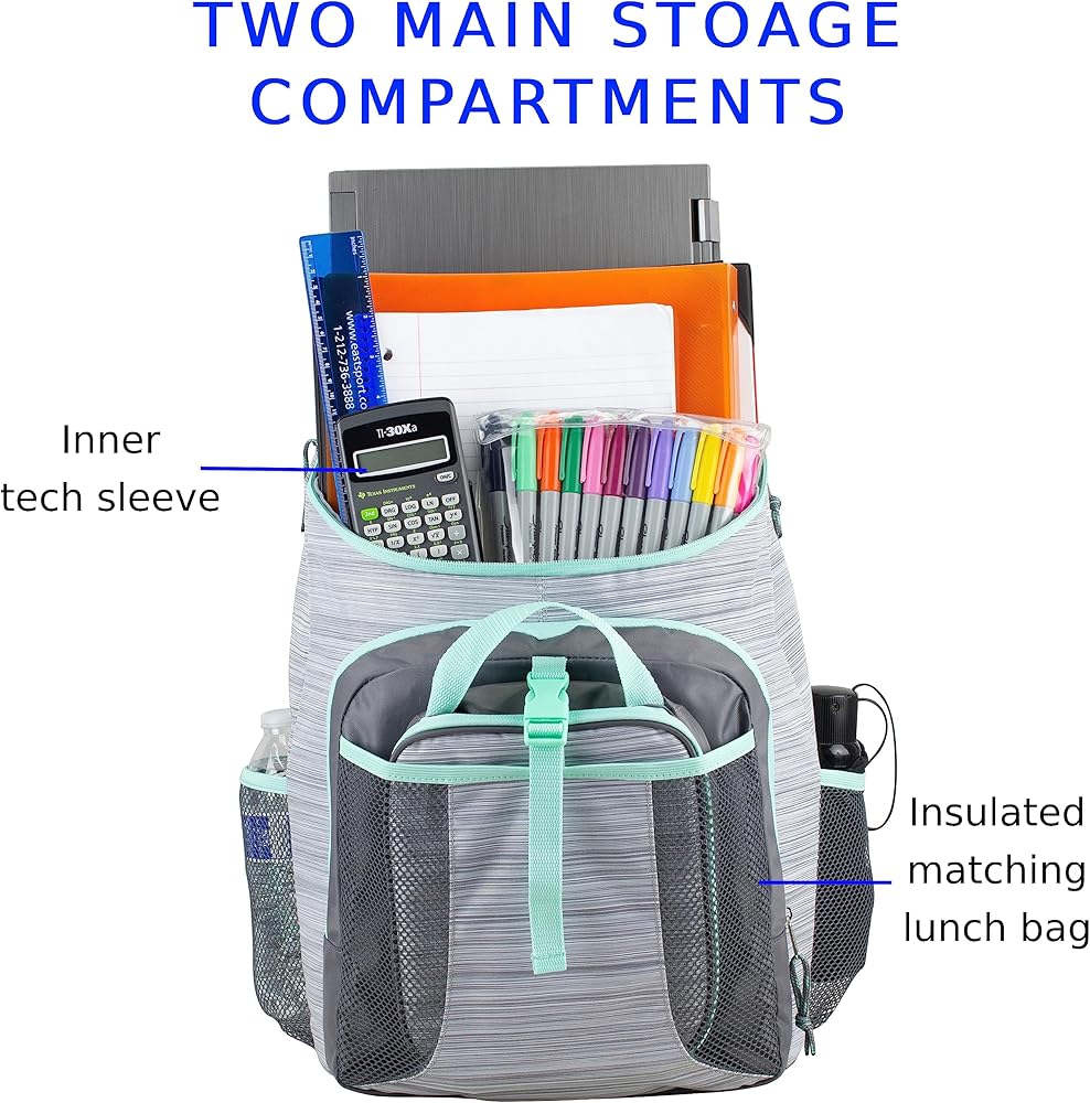 Perfect 18.5” x 12” x 8” backpack made out of durable and water-resistant polyester with matching lunch box, two water bottle pockets, includes interior pocket for small laptops and tablets