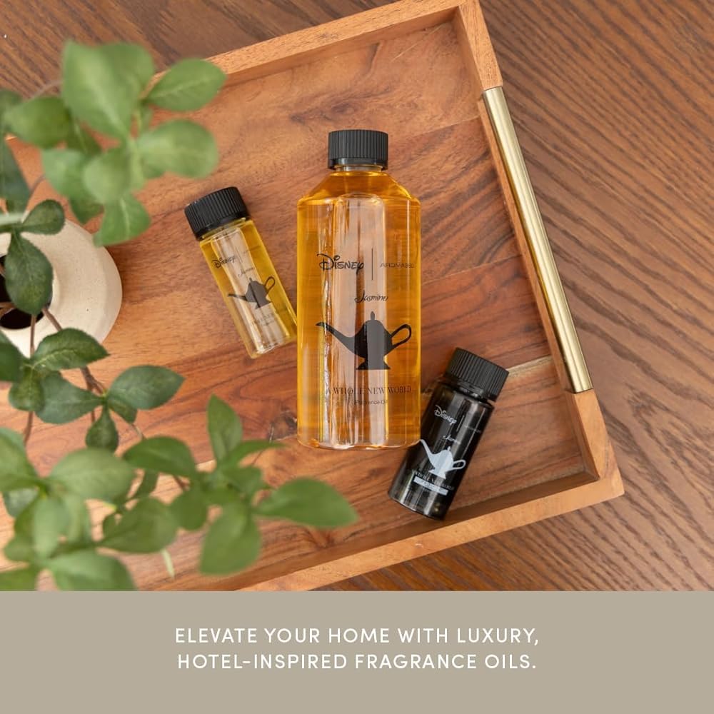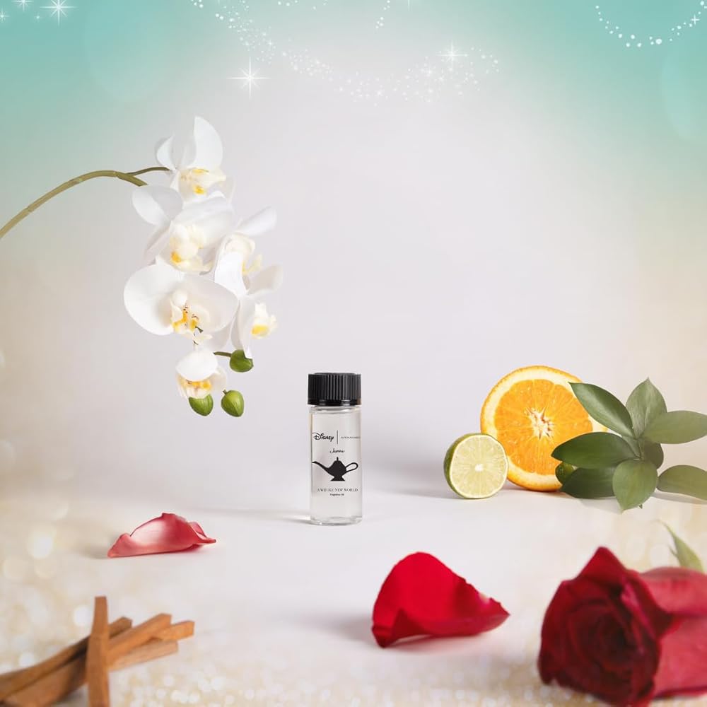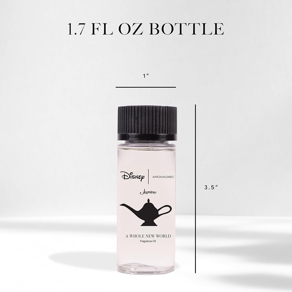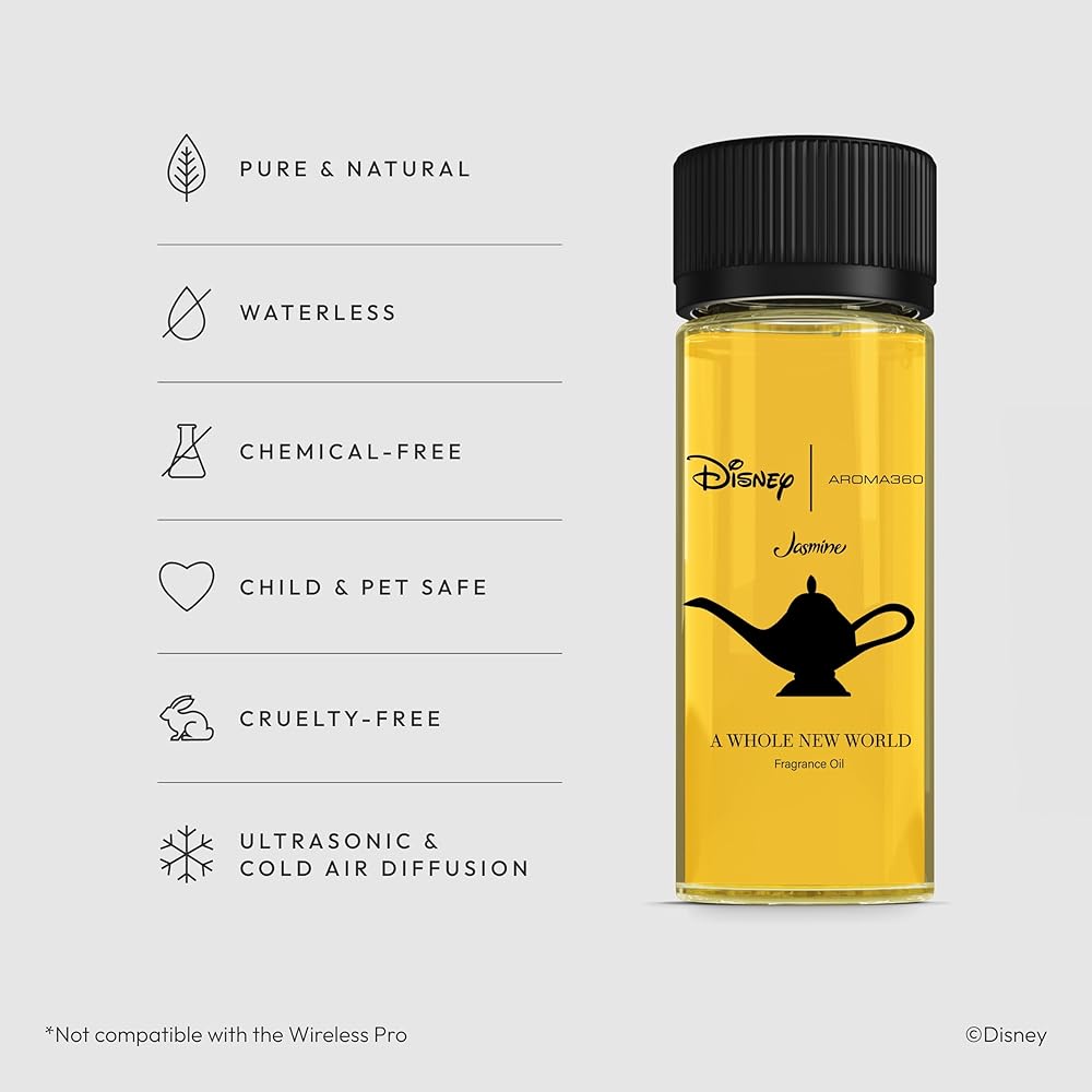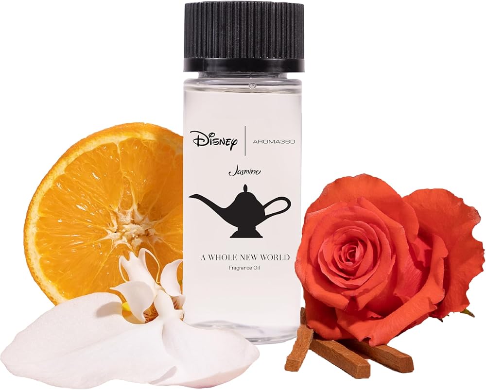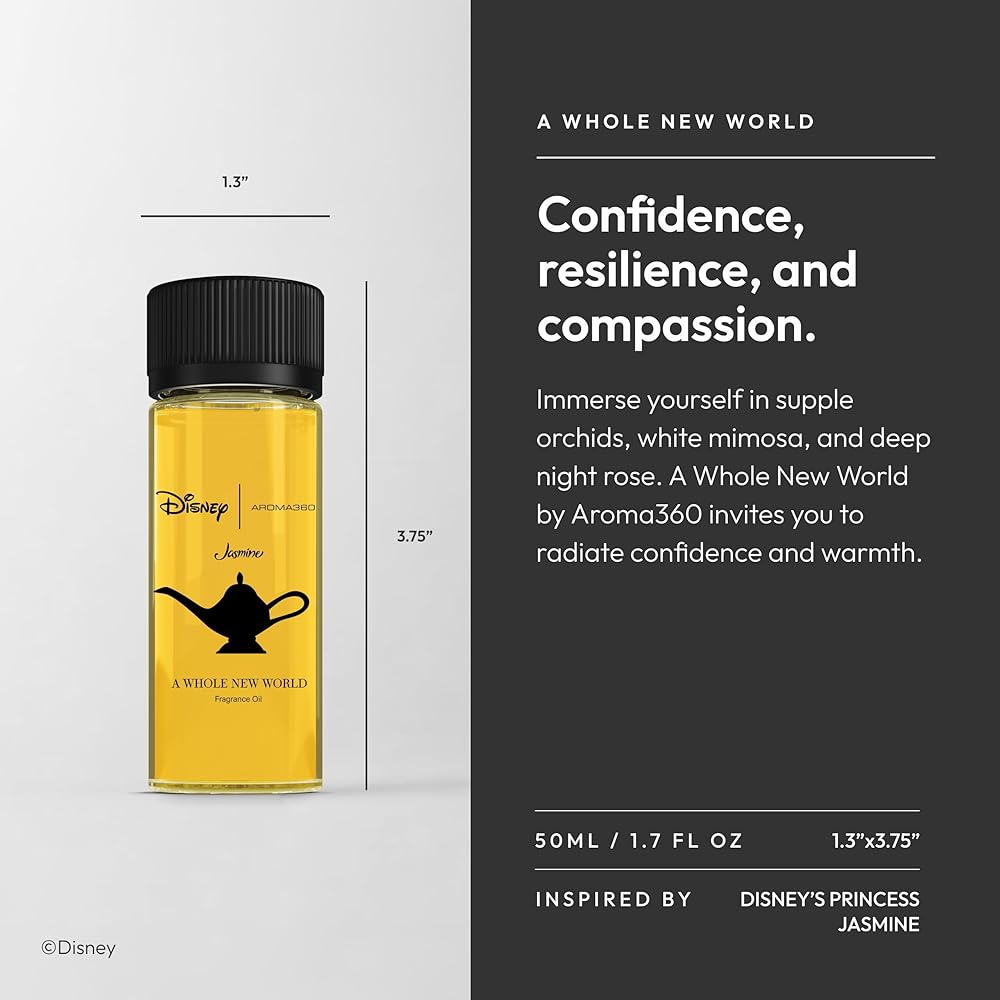 Designed For: Disney's Princess Jasmine Introducing Aroma360's tribute to a timeless character. This fragrance, available in 50 ml Oil, 50 ml Pro-Pod, and 500 ml Oil, draws inspiration from the qualities Disney's Princess Jasmine embodies: confidence, resilience, and compassion. Dive into a sensory experience with notes of supple orchids, enticing white mimosa, and the deep aroma of night rose. A Whole New World by Aroma360 isn't just a scent; it's an invitation to radiate confidence and warmth, touching the lives of those around you. With every breath, let the essence of this oil remind you of the spirit of discovery and the wonder of new experiences. Welcome this fragrance into your space, and be inspired by the allure of endless possibilities. Allow A Whole New World to symbolize the beauty and strength within you. Top Note - Bergamot, Orange Blossom, Rose Middle Note - Orchid, White Mimosa, Narcissus Base Note - Oud Wood, Teak, Sandalwood.