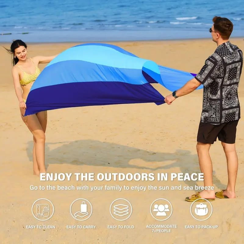 Our large, lightweight beach blanket protects against sand and moisture. It removes sand easily and dries quickly. This means you can enjoy your time outside without all the clutter. The light and breathable cushion will help you start a relaxing day at the beach.Compact size to carry Easy to fold for storage Water, sand, wind resistant Lightweight and sturdy 4 Corner pockets and stakes Breathable and super fast drying Package Details: 1 x Beach Blanket 1 x Carry Bag 1 x Carabiner 4 x Ground Stakes