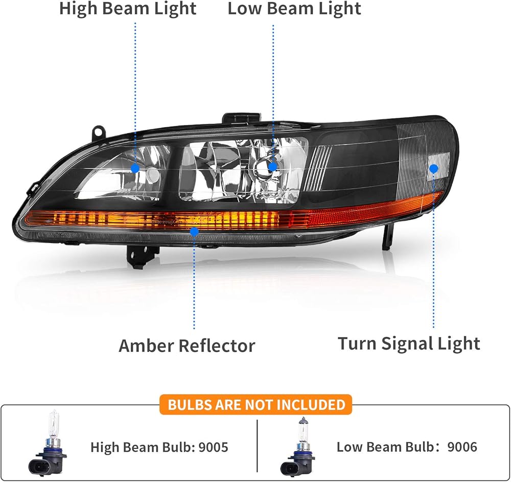 Compatibility: the headlight assemblies are compatible with 1998 1999 2000 2001 2002 Accord; high beam: 9005 low beam: 9006; bulbs are not included