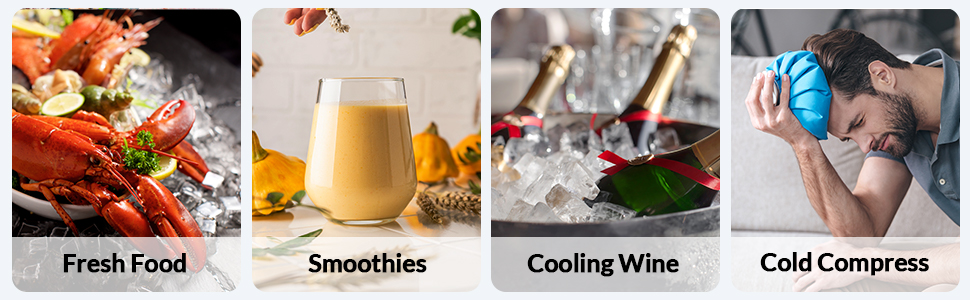 • Chilling & Pure! -Nobody can stand a scorching summer without ice. Keeping food fresh, creating cold drinks, chilling beers, and champagne, it all comes true with an ice maker. Besides, square ice cubes are featured with slow-melting, fine in shape, and pure in clarity and density.