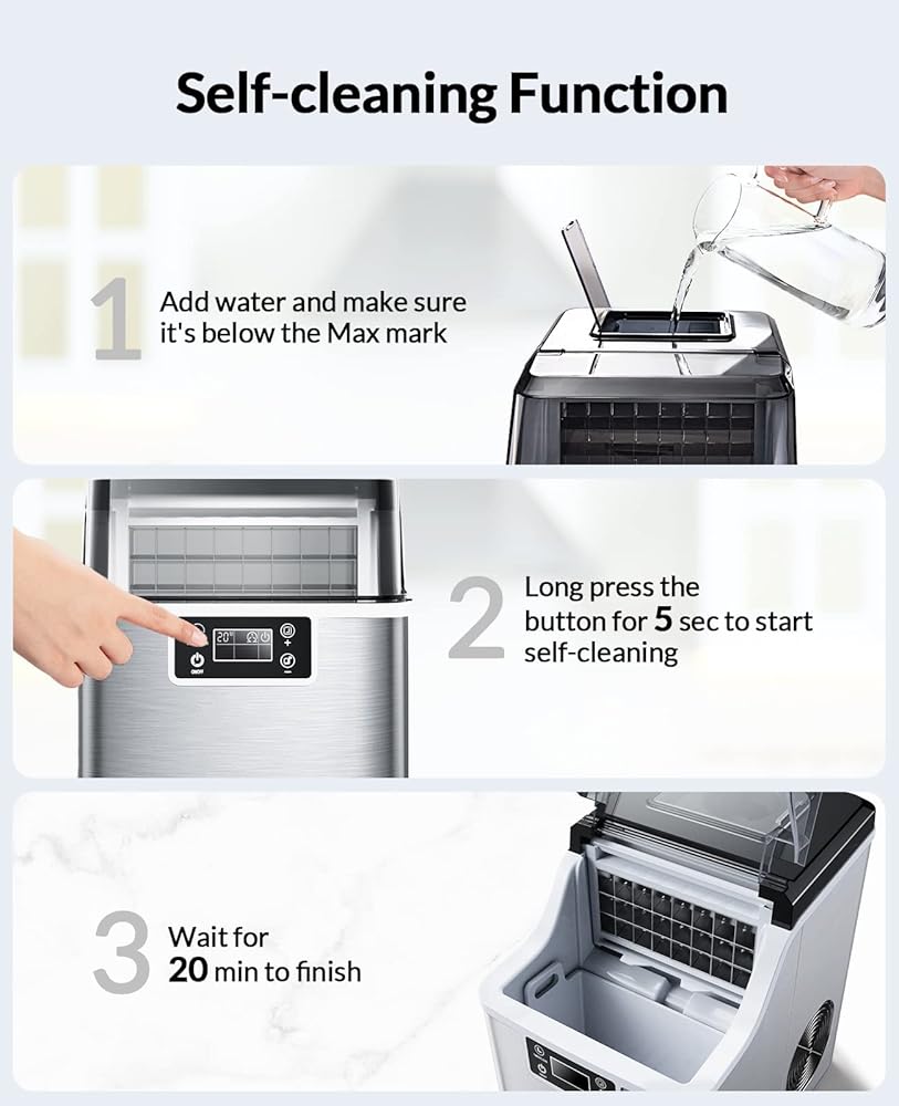 • Self-Cleaning Function-What could possibly cause you more headache other than cleaning a daily-used electric device? As a modern home device, this countertop ice maker is equipped with a self-cleaning function, one press on the panel and 20 min is all it takes to get a thorough self-cleaning.