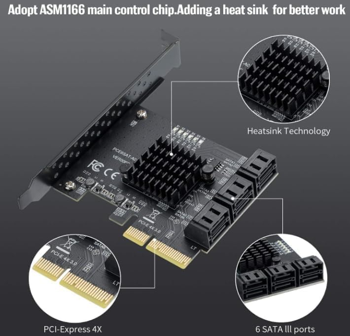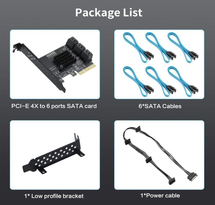 1 x PCIe X1 to 6 SATA 3.0 card 6 x SATA cables.