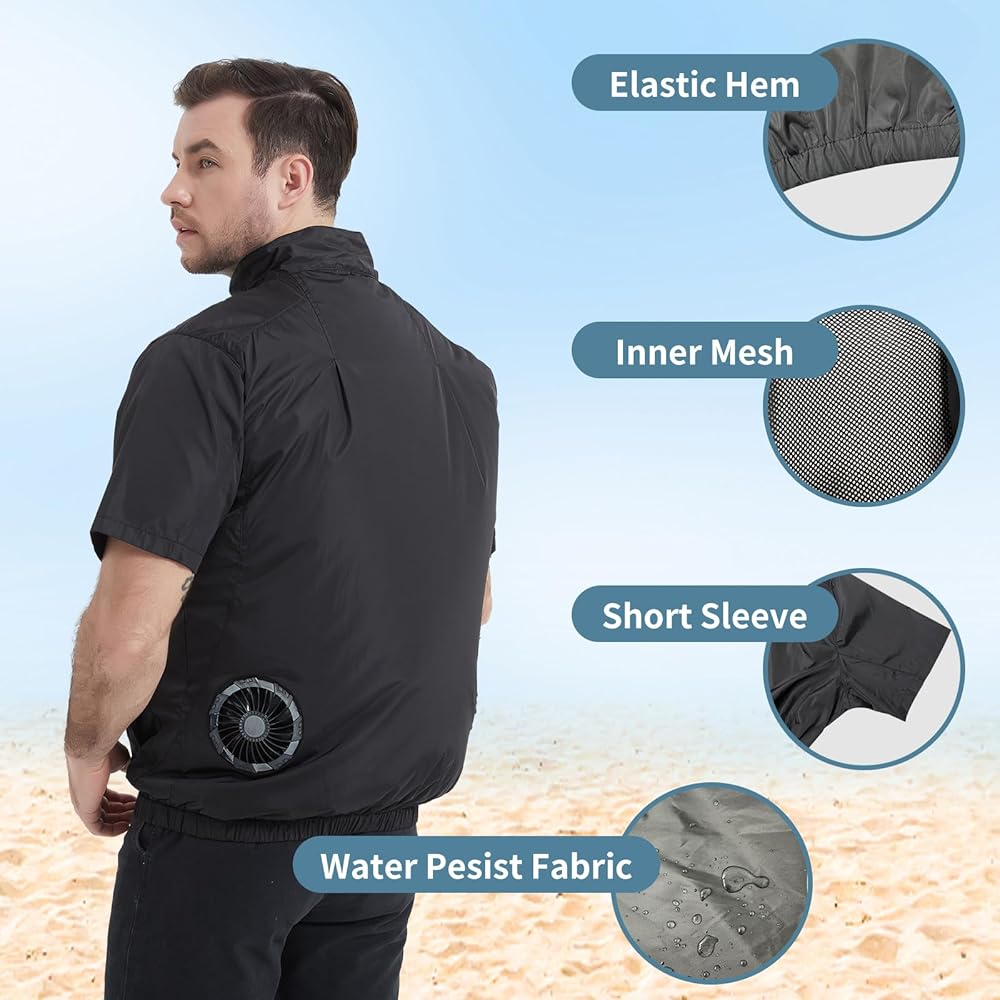 4 Speeds Adjustable: The fan short sleeve jacket vest has 4-speed setting which can be switched easily by pressing the battery button. Enjoy cool, free-flowing air at the pace of your choice. Long press for three seconds to turn ON/OFF.