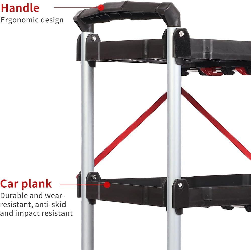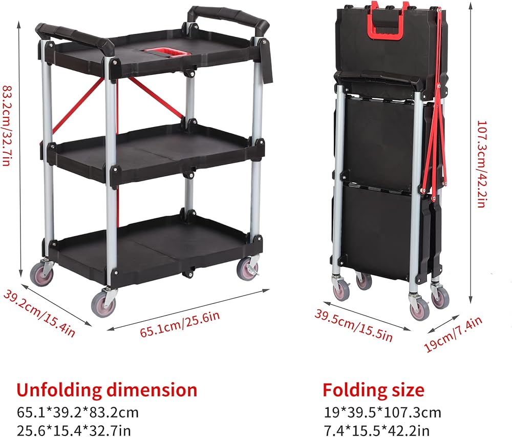 【Wide Application and Easy to Install】This fold up rolling cart can be used to transport your products, books, snacks, mechanic tools, garden equipment, and so on. It is very easy to install it in seconds following the instruction.