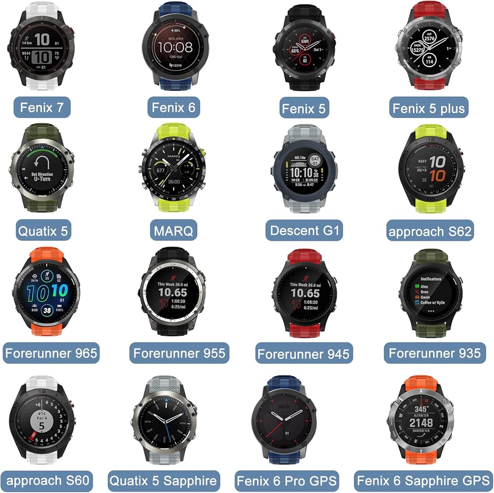 Compatible models: soft silicone strap for Garmin Forerunner 965/Garmin Forerunner 955/Garmin Forerunner 945/Garmin Forerunner 935/Garmin Descent G1/Fenix 7/Garmin approach S62/Garmin approach S60/Fenix 6/Fenix 6 Pro/Fenix 6 Sapphire/Garmin Fenix 5/Fenix 5 plus/Quatix 5/Quatix 5 Sapphire . Vibrant appearance, multi-color options will provide you with a free lifestyle.