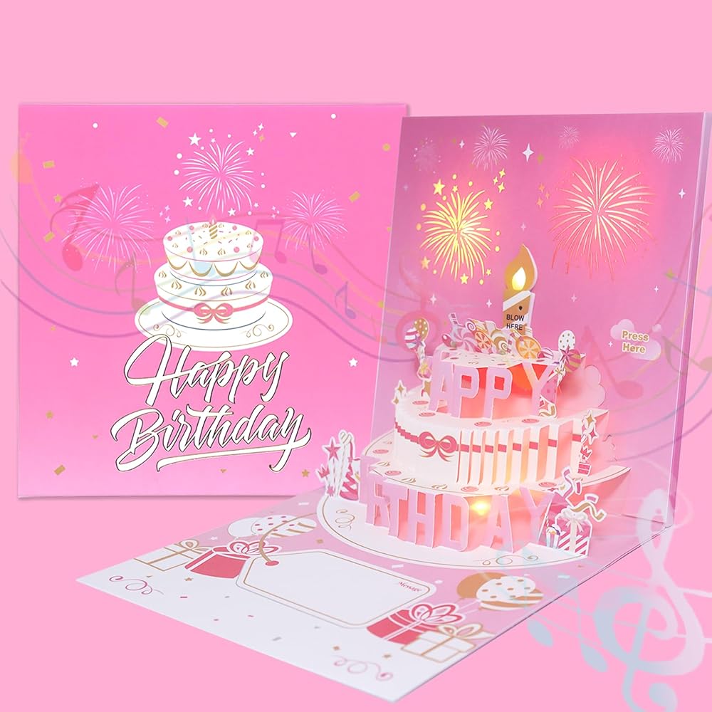 【Smart design concept】: This lovely pop-up card uses an exciting unique 3D design, with interesting rich pictures, Add fireworks,flashing lights, and celebrates the Birthday party with the theme of "Happy Birthday".