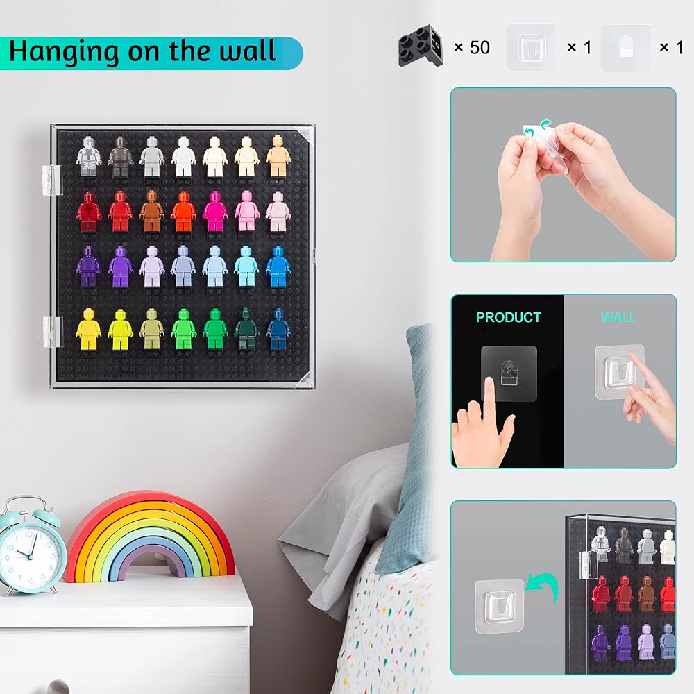 Secure and Stable: The case includes 50 baseplates (foot supports) for minifigure stability, providing a secure grip for both transport and display. Choose between standing the display case upright or mounting it on a wall using self-adhesive hooks for added safety.
