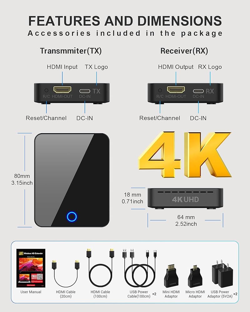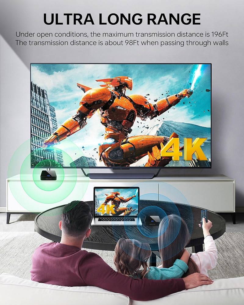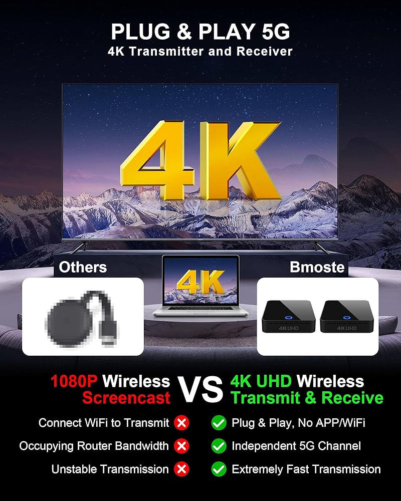 Experience unparalleled wireless connectivity with the BMOSTE 910 Wireless HDMI Transmitter and Receiver. This state-of-the-art device is engineered for 4K hardware decoding, allowing you to wirelessly stream 4K Ultra HD media at 30Hz with pristine clarity. Whether you're transmitting 4K content or 1080P video, the BMOSTE 910 ensures a stable and latency-free experience, with the latter benefiting from enhanced stability and reduced latency.