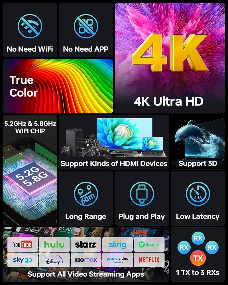 The 1 TX to 3 RXS capability enables you to connect three receivers simultaneously, allowing your video content to be displayed across multiple screens at once.