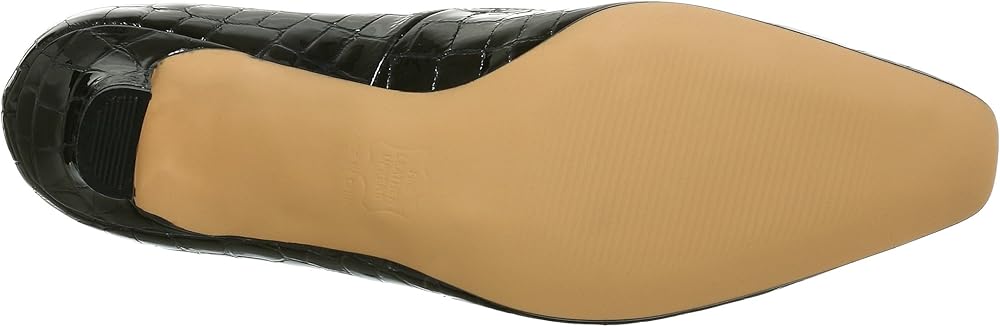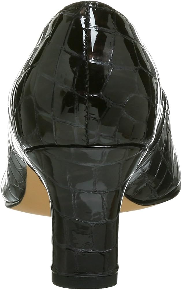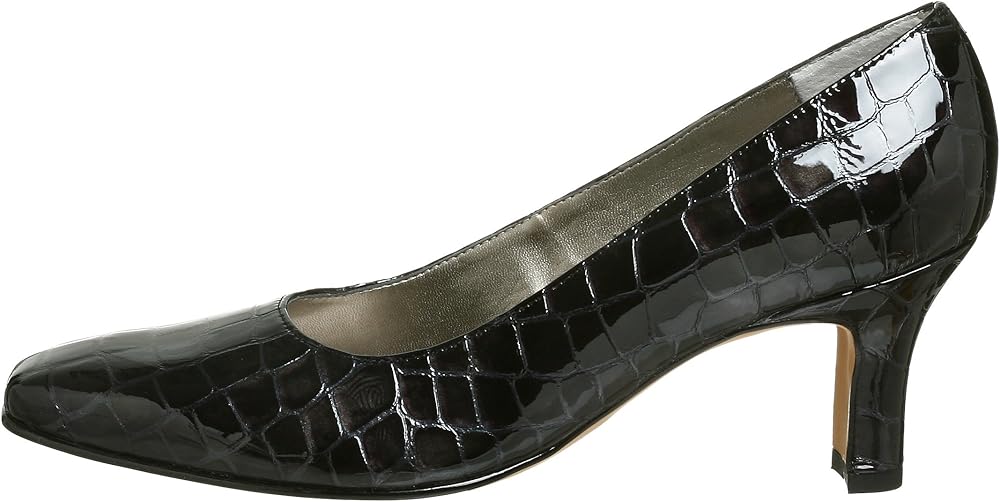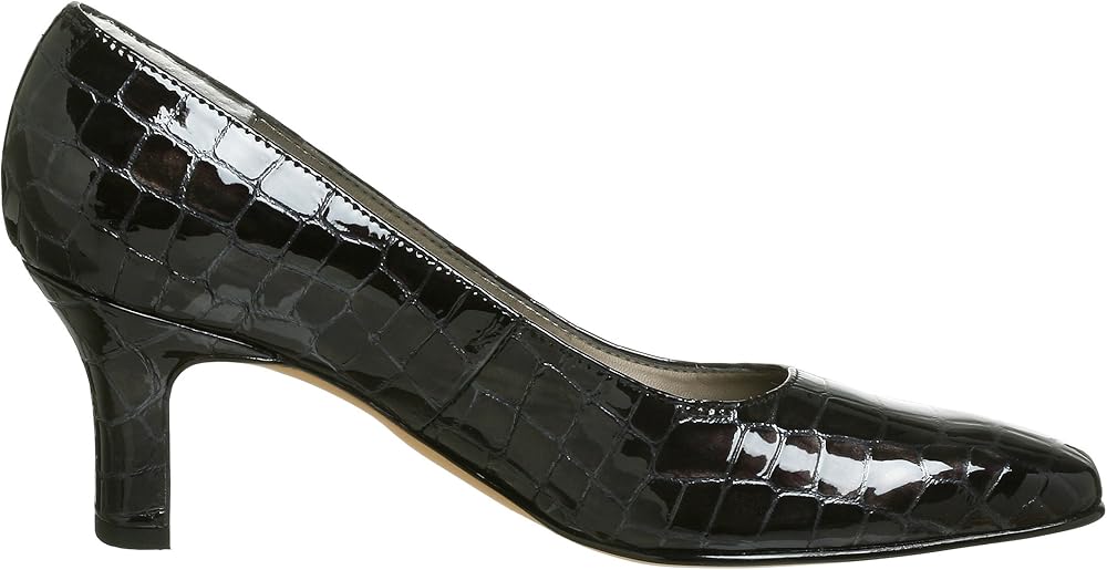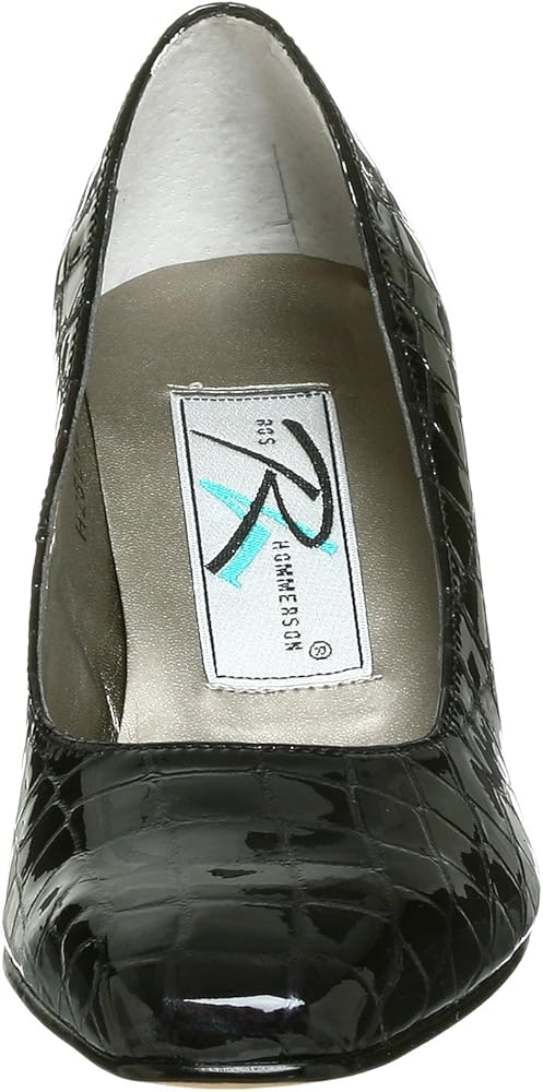 A perfect accompaniment to a short, sexy cocktail dress or elegant evening gown, this exquisite pump from Ross Hommerson will flatter you endlessly. The shiny croc patent leather upper features a stylish squared toe, and the solid mid-height heel gives just the right amount of lift without sacrificing comfort. A lightly padded insole cushions the foot, while the slightly treaded outsole and rubber heel cap offer durability, stability and long-lasting wear.