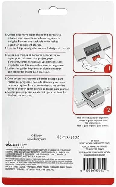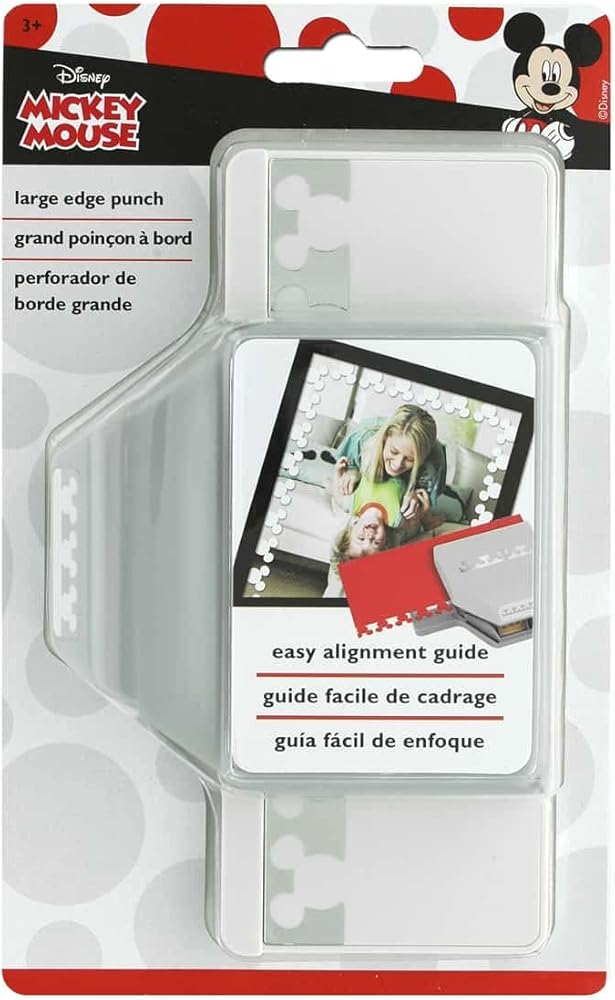The Disney Mickey Ears edger punch is perfect for cards, scrapbook pag es and many other craft projects. The squeeze action of punching makes it easy to use. Line up the border using the template plate on the ba se of the punch for an edge of any length. The package measures 7. 625 x 4. 75 x 1. 5 inches. Imported.