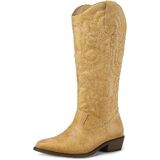 mysoft Women's Cowboy Boots Mid Calf Cowgirl Embroidered Western Pointed Toe Chunky Heel Pull On Knee High Boots