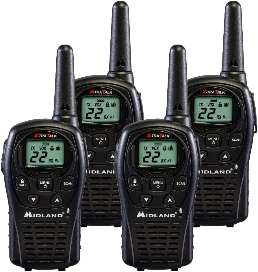Midland LXT500-VP3 comes with four radios, 4 belt clips, 2 desktop chargers, 2 AC wall adapters, 4 rechargeable batteries and a three year warranty from Midland.