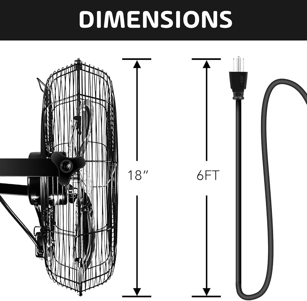 Thoughtful & Enhanced Design -Our 18 Inches tilt-around fan tilts a full 360 degrees made out of powder coated steel construction and premium ball bearing motors. Rear-mounted controls allows you to adjust different speeds easily. OSHA compliant rust-resistant grille, Extra long 6 feet power cord, 3-speed heavy duty thermally protected 115-Volt, 60 Hz, PSC motor.
