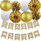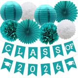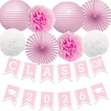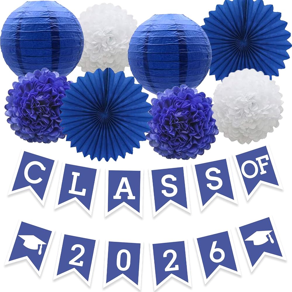 Quantity: 1 blue class of 2024 banner with 2 red grad caps, 2 blue pom poms flowers, 2 red pom poms flowers, 2 blue paper lanterns, 2 red paper fan flowers